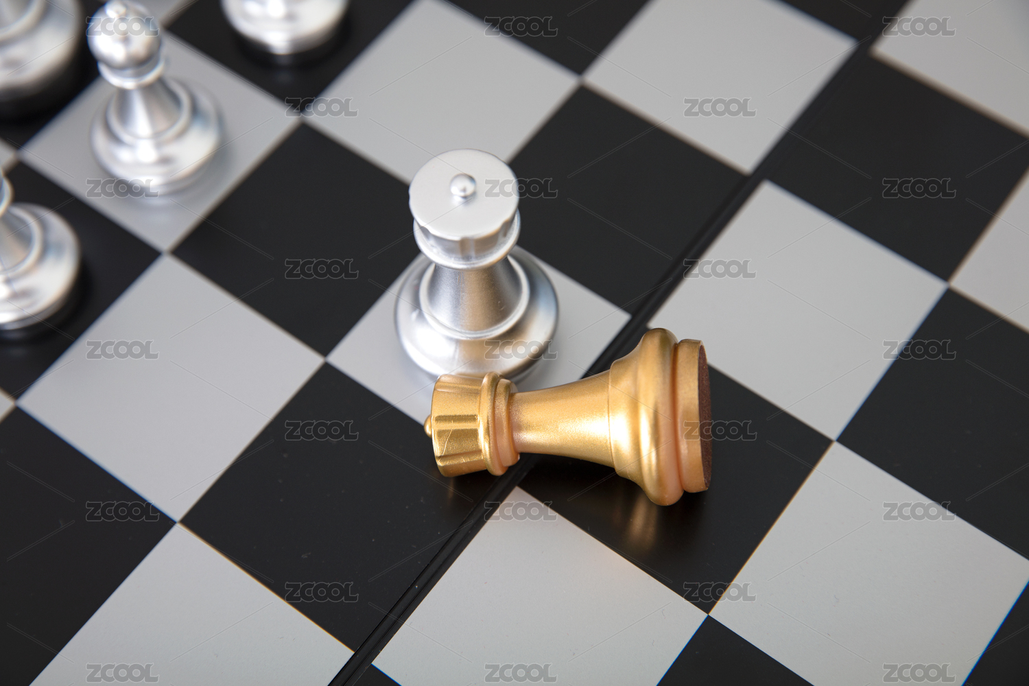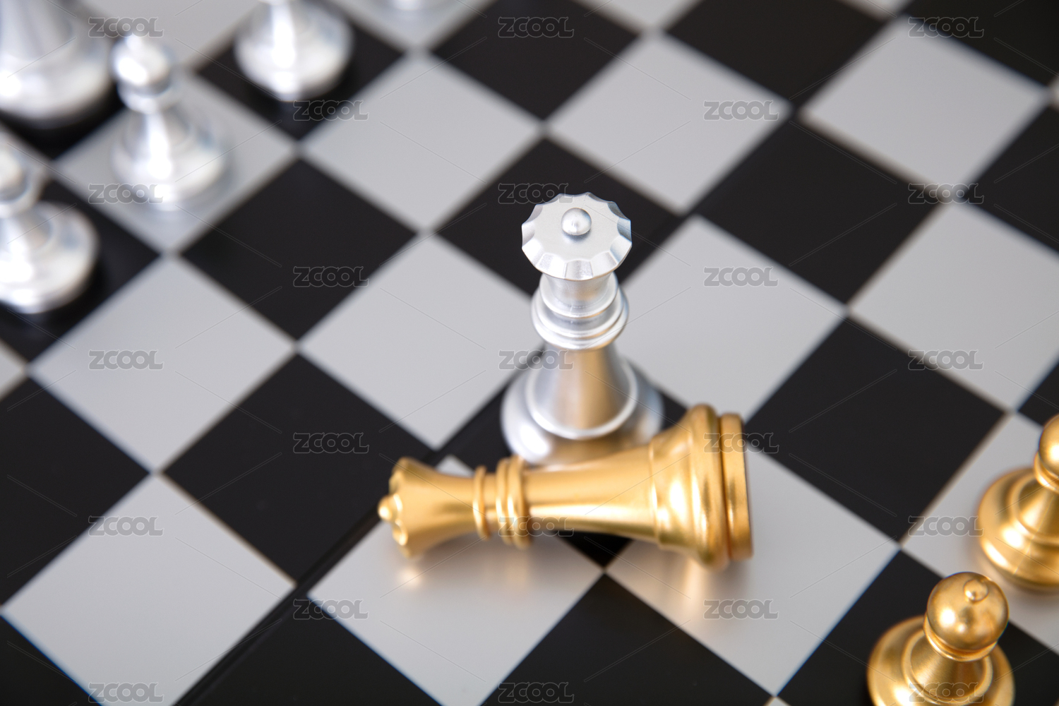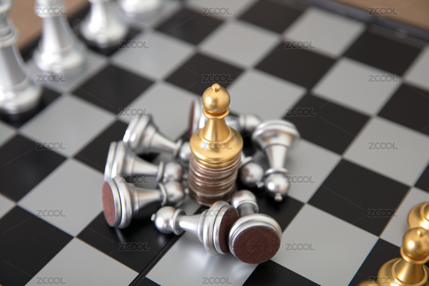 国际象棋棋盘上银色的皇后棋子向站在硬币上的金色皇后棋子下跪