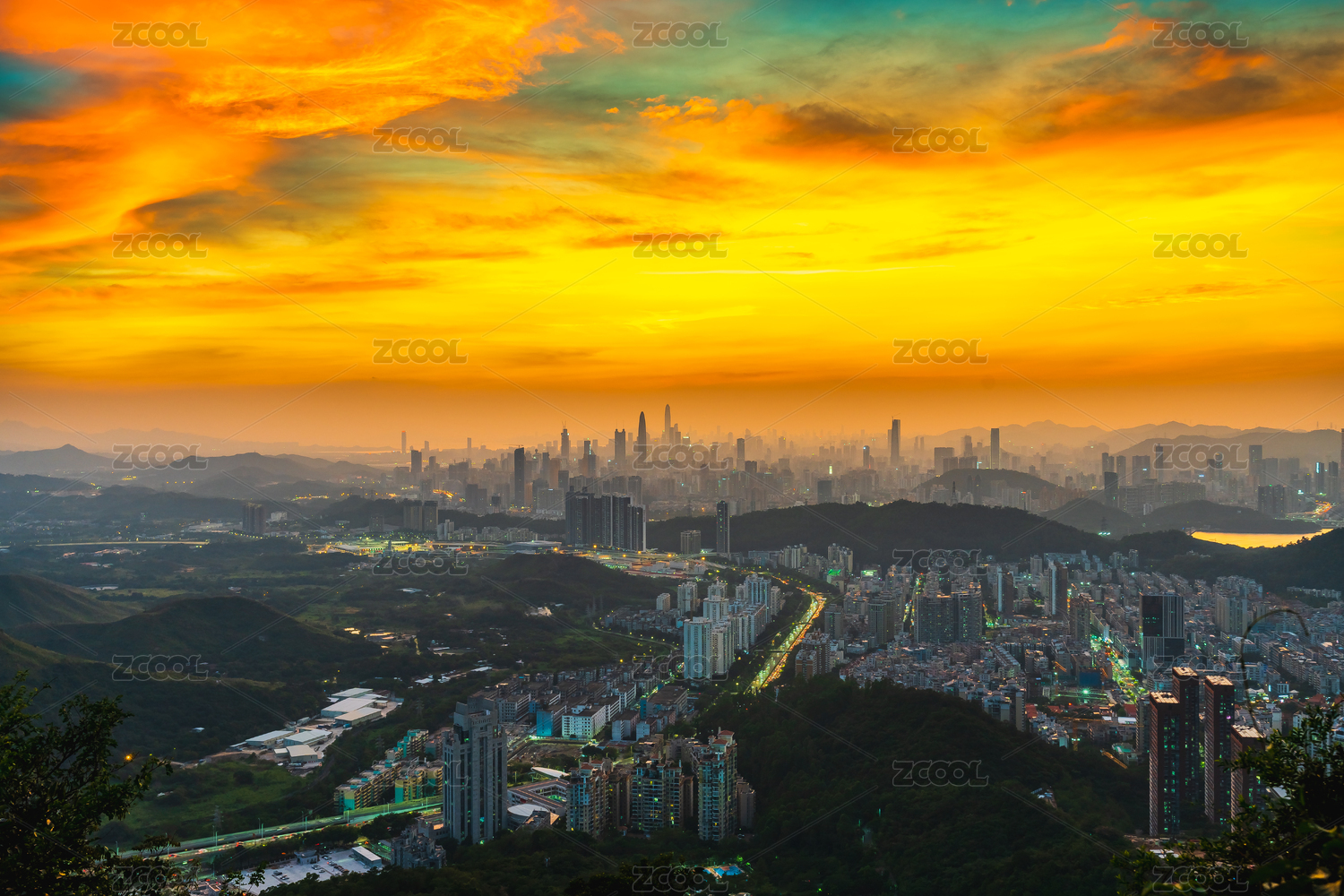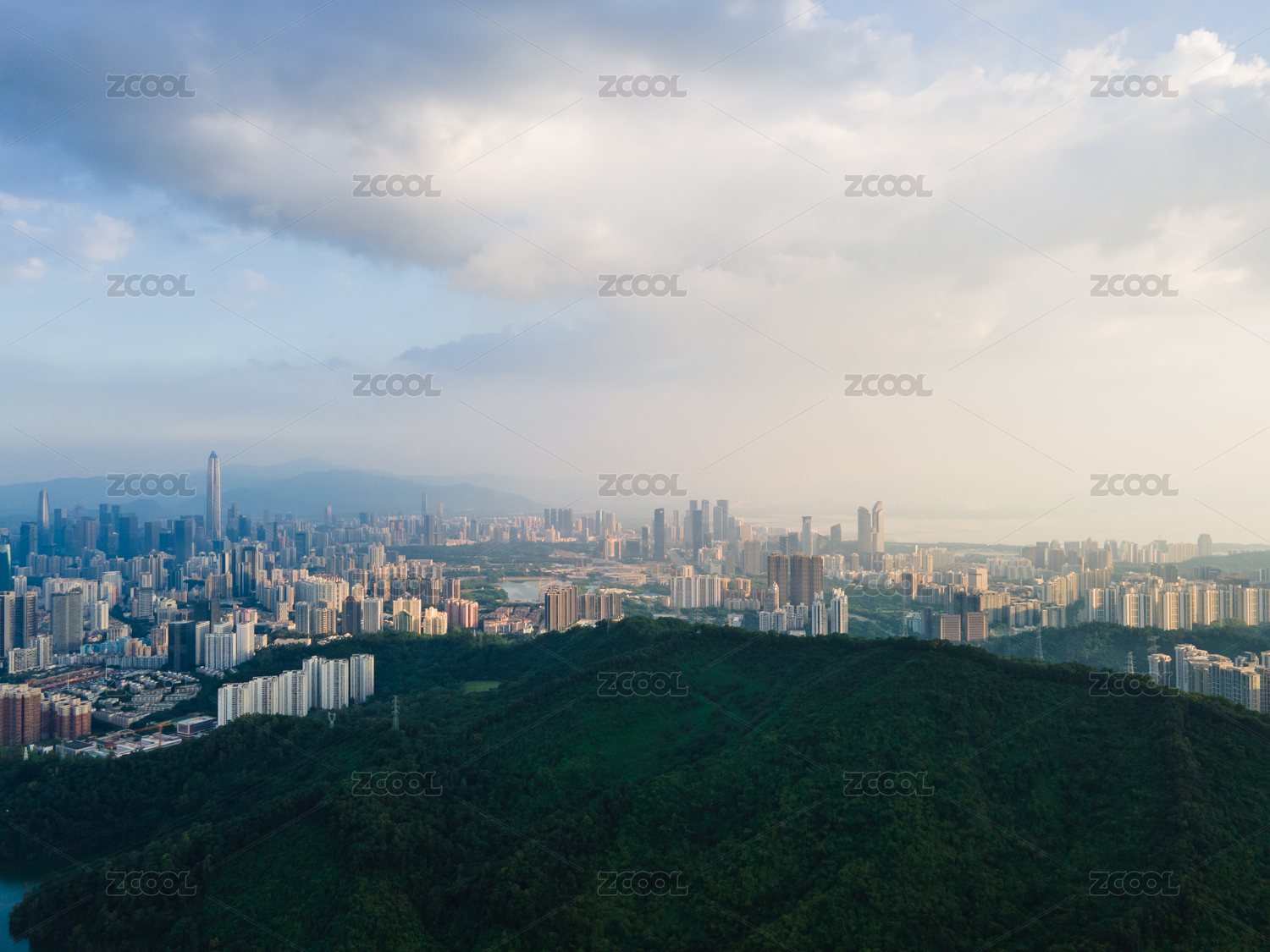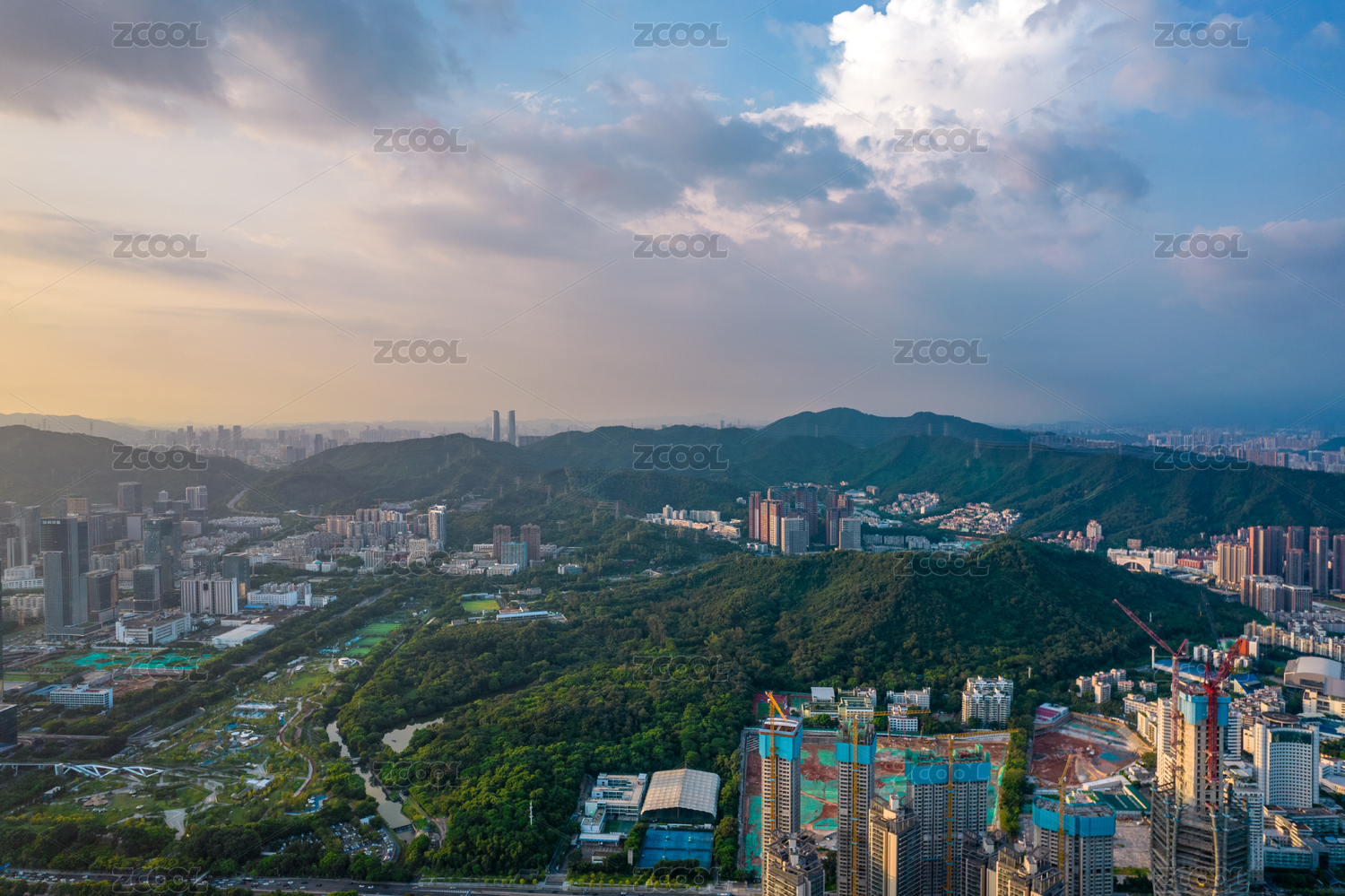 广东深圳南山塘朗山上远看福田中心夕阳风光