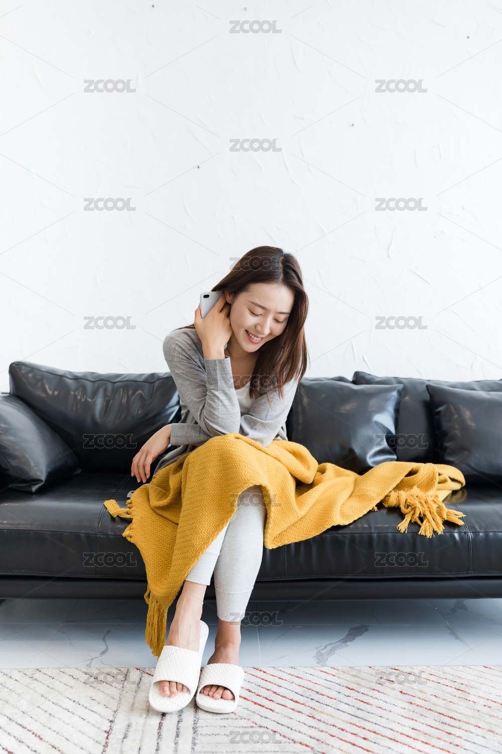美女休闲地躺在家中沙发上