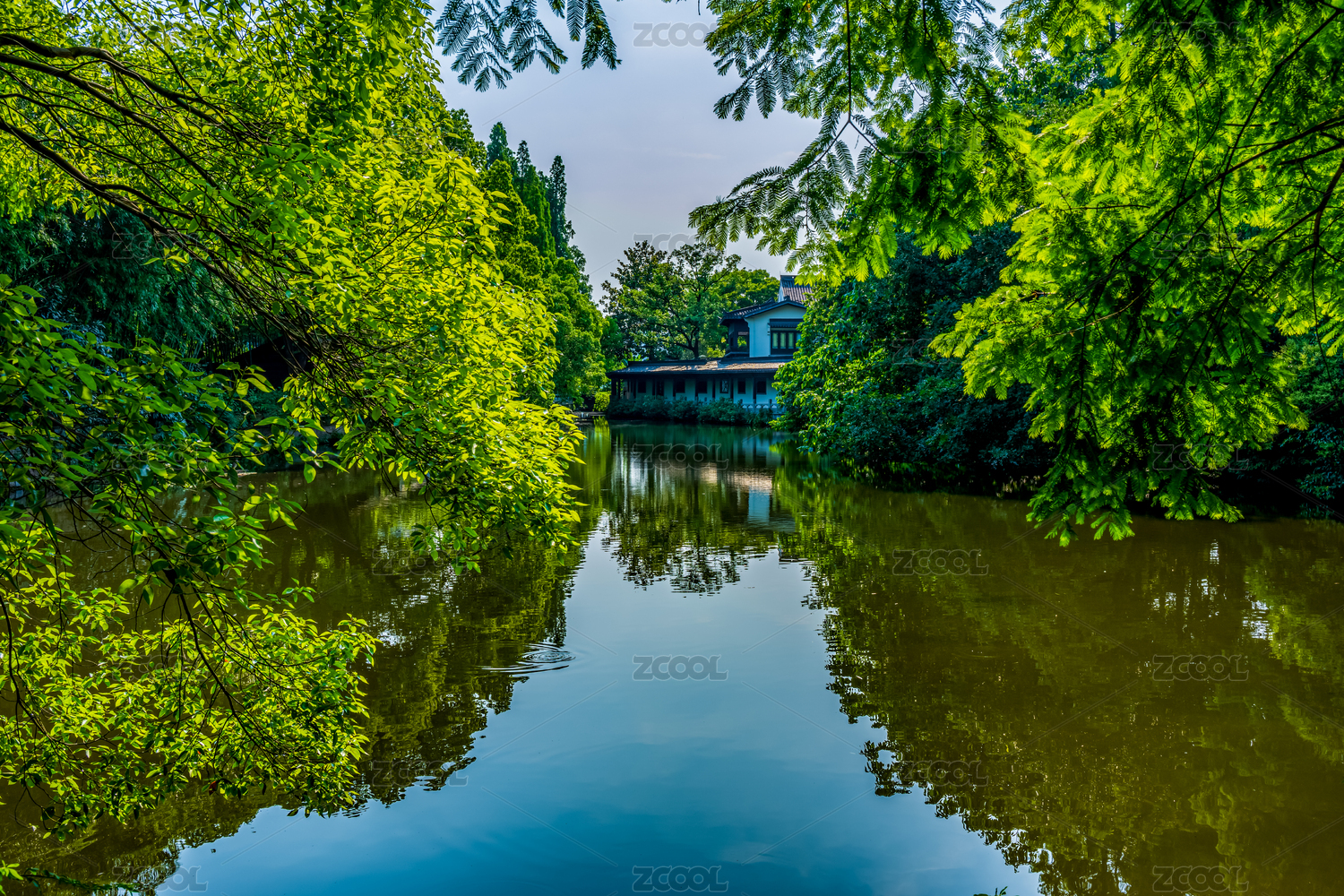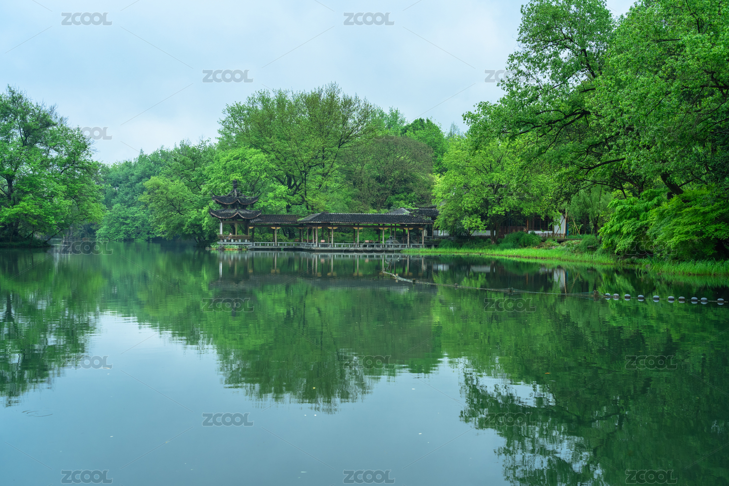 江南杭州西湖浴鹄湾春天春雨阴雨天自然建筑