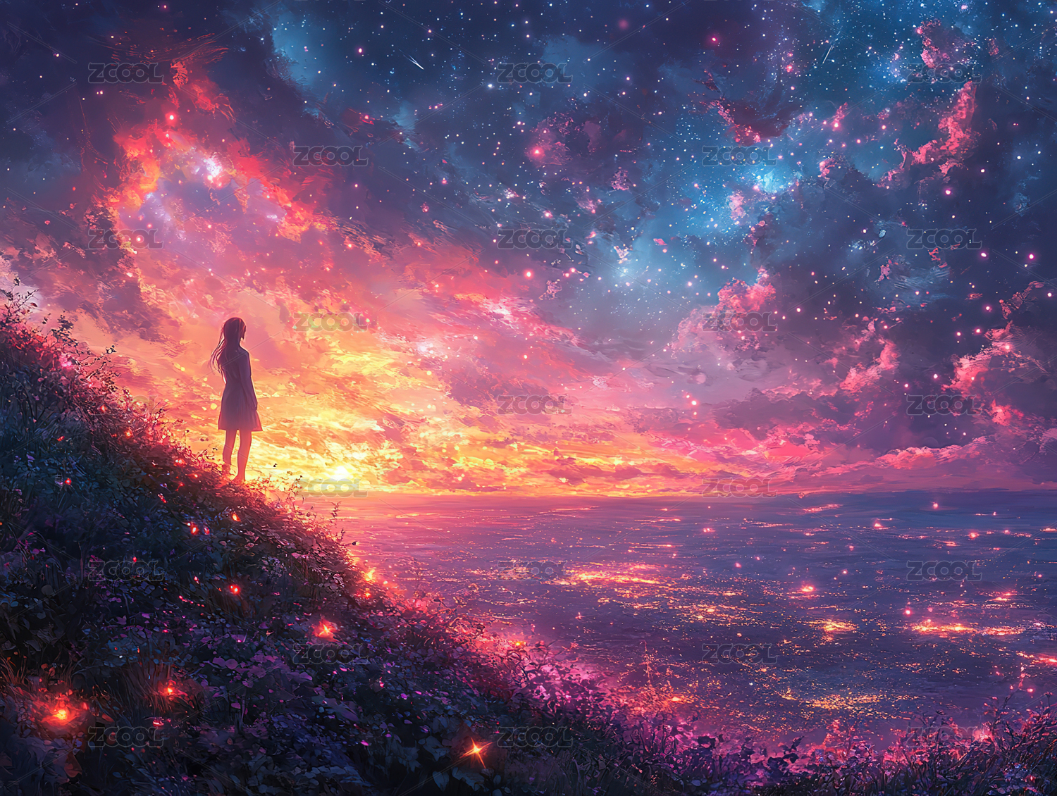 手绘唯美的抽象艺术感夜晚天空风景插画