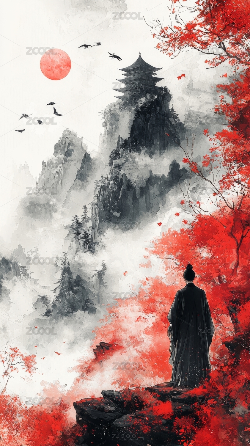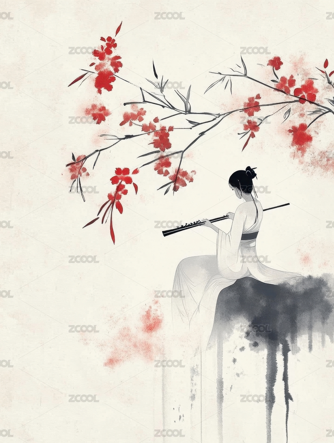水墨梅花红衣人影
