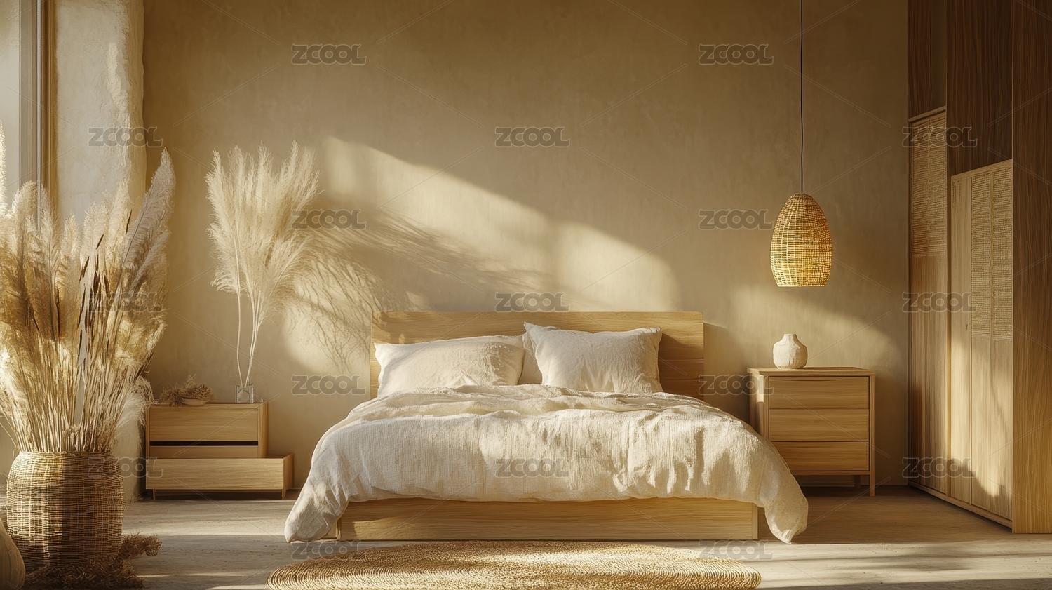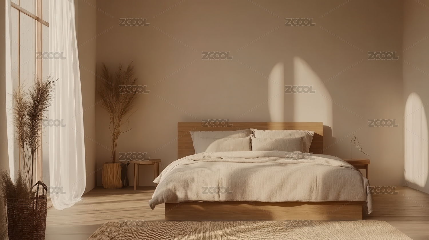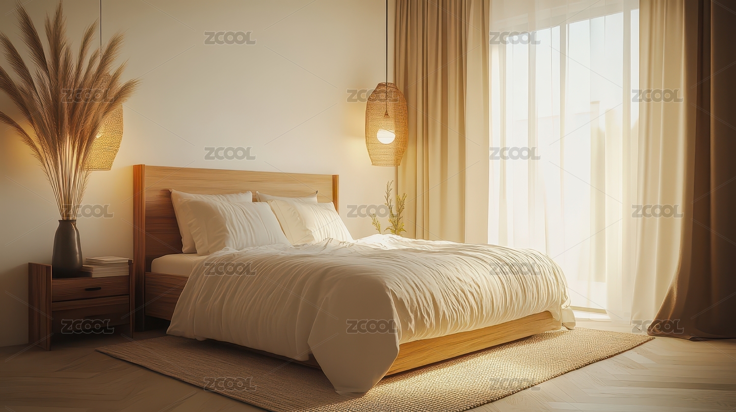 浅色调,卧室设计,床,枕头,窗帘,落地灯,台灯,木桌,花瓶,装饰品