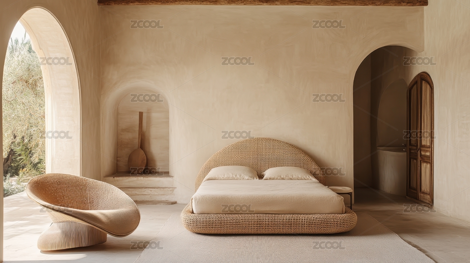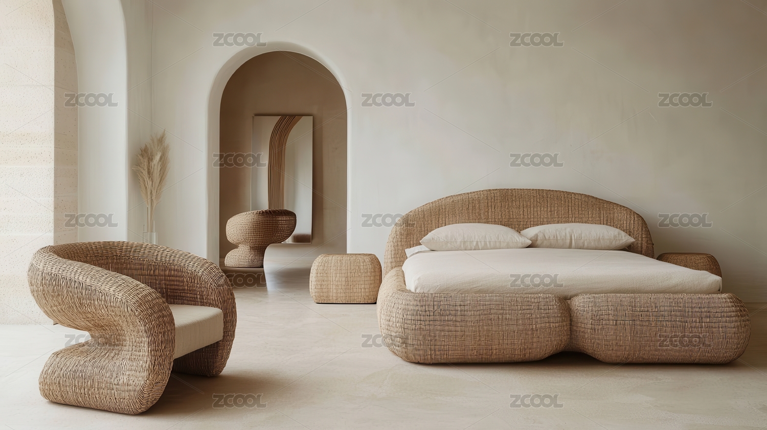 卧室,床,藤编,家具,温馨,舒适,地毯,自然,简约,现代