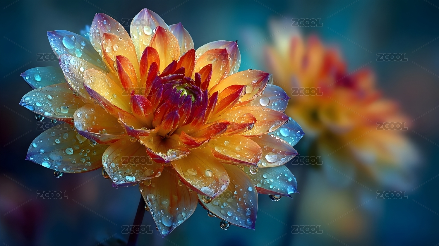 多彩花瓣上的水滴特写