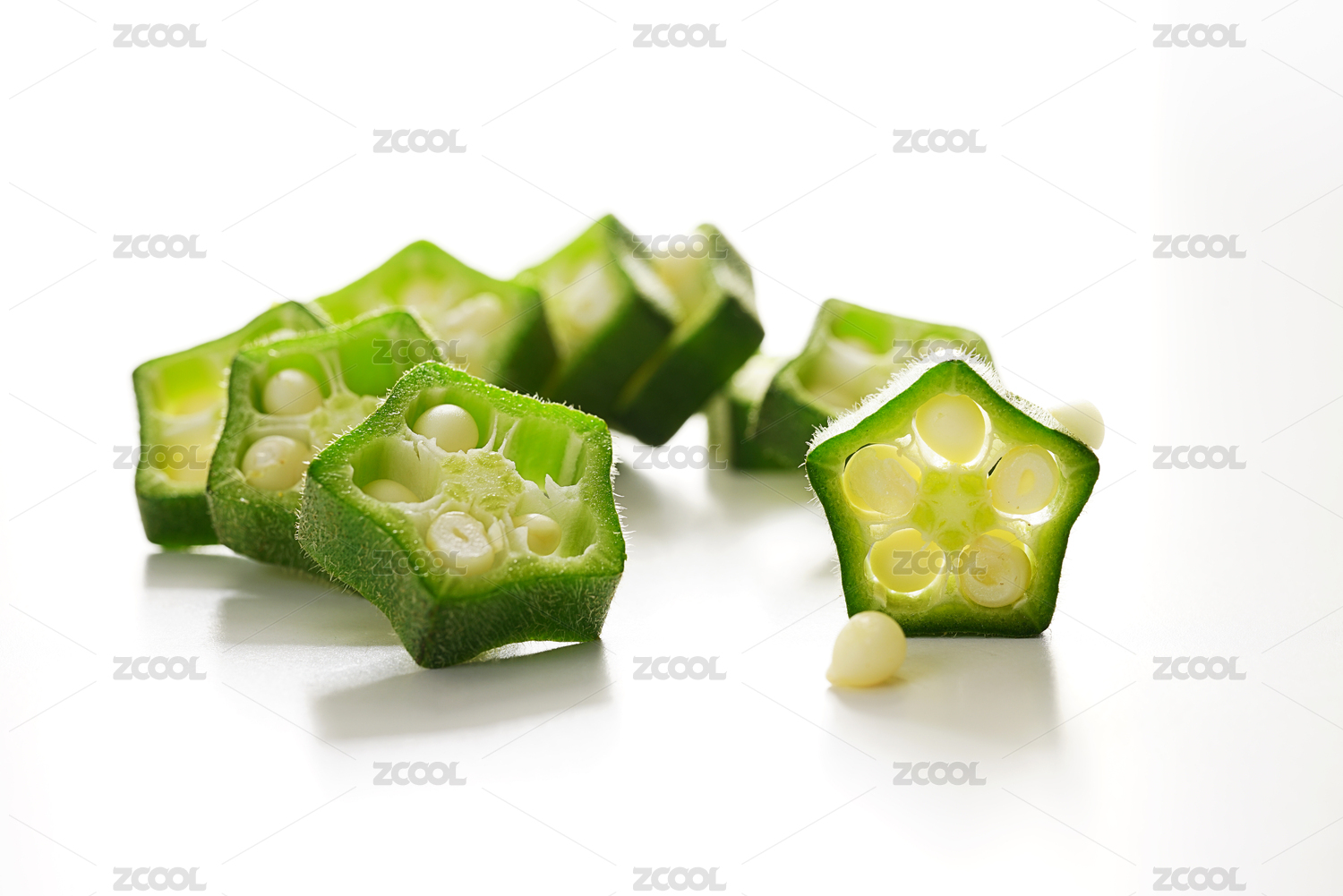 白色背景中的 新鲜嫩绿的秋葵切成片