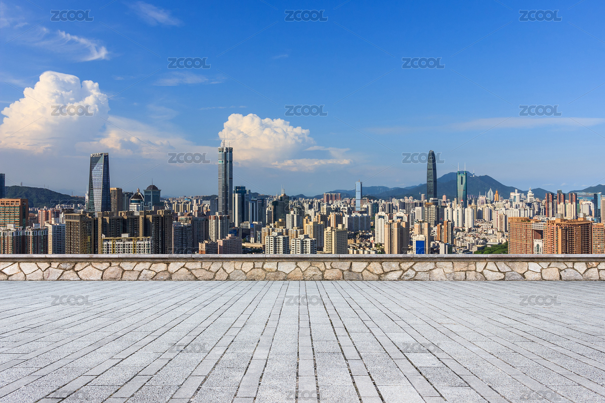 前景宽阔的地面和中国深圳城市天际线建筑群高楼大厦