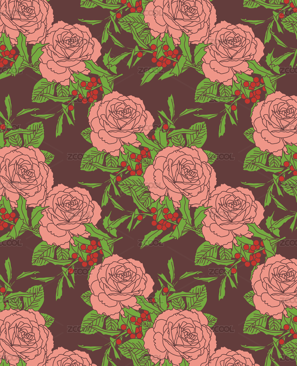 红粉绿圣诞玫瑰冬青红果花朵无缝图案