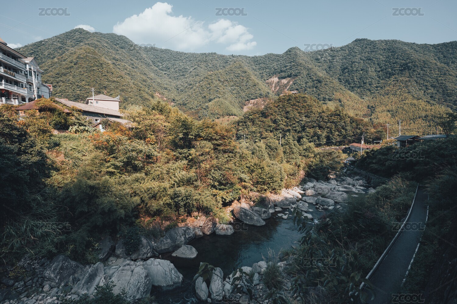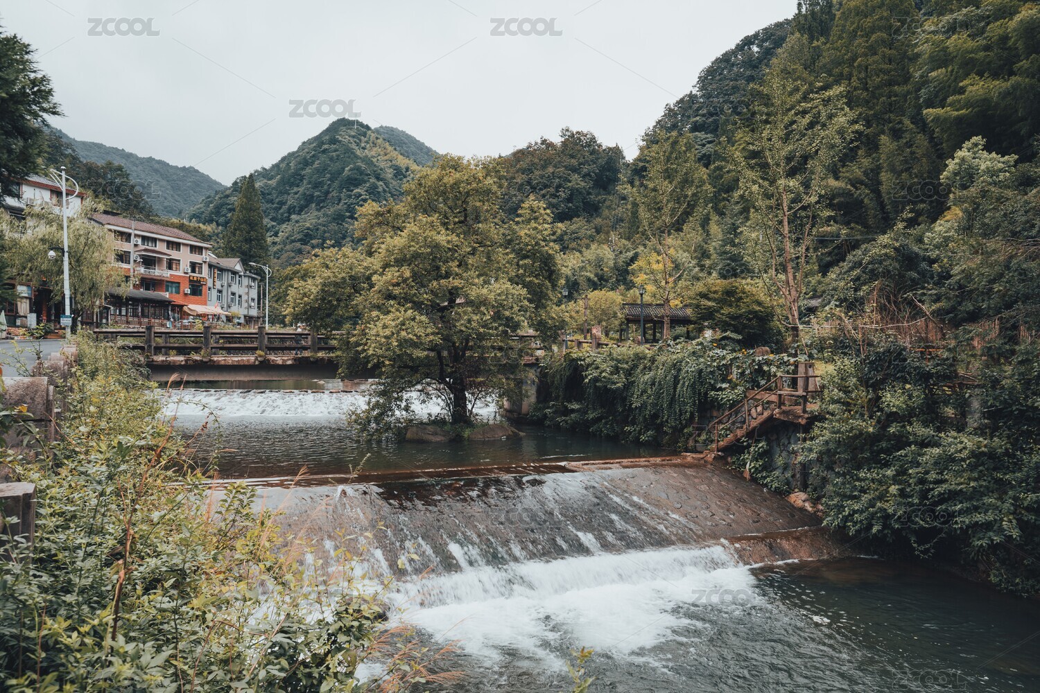 山间小溪鱼两岸小镇风光
