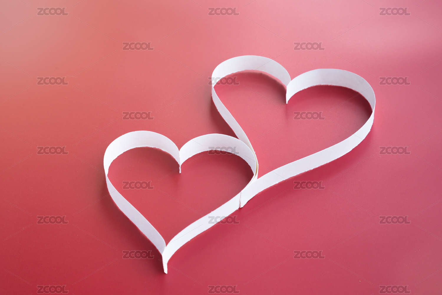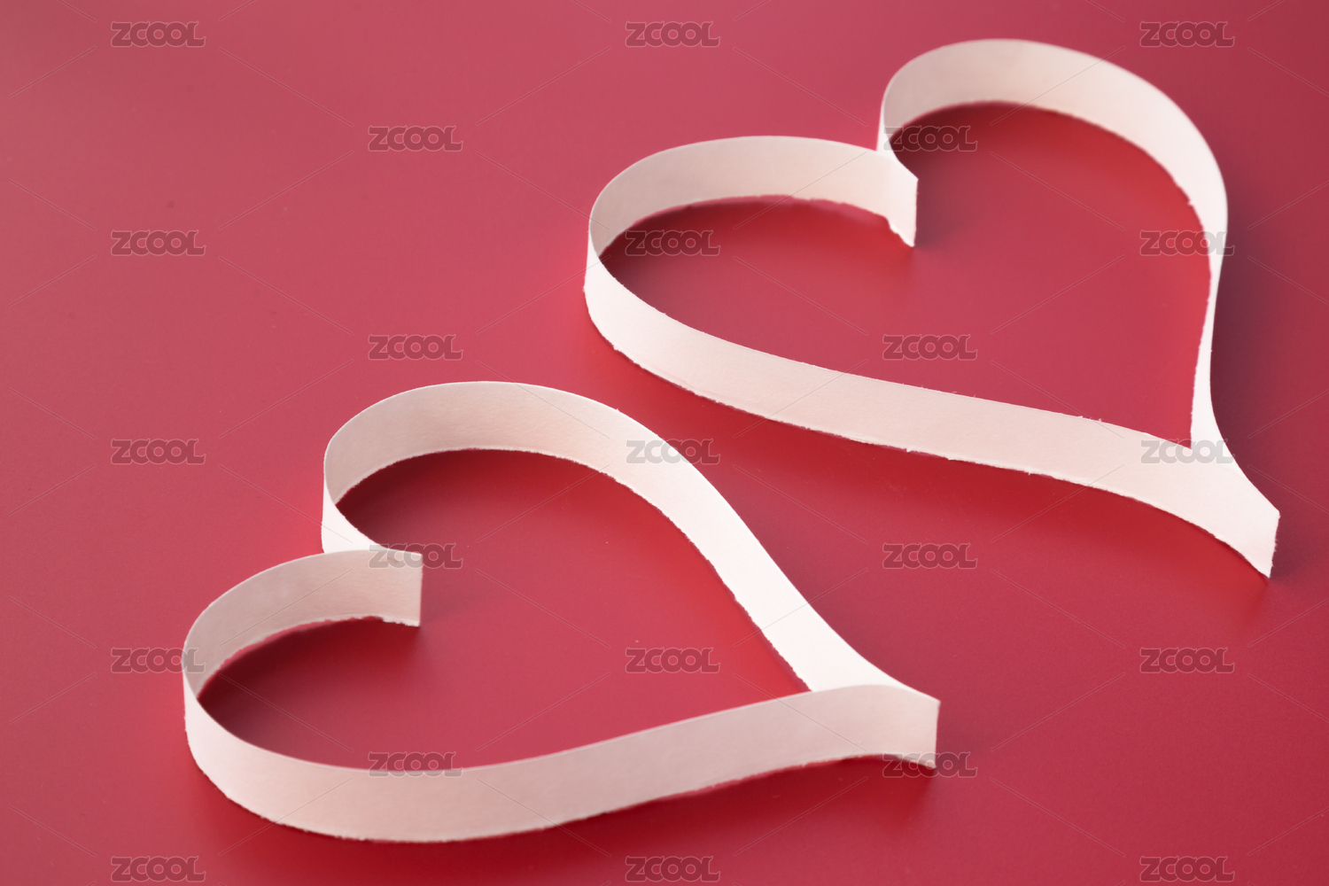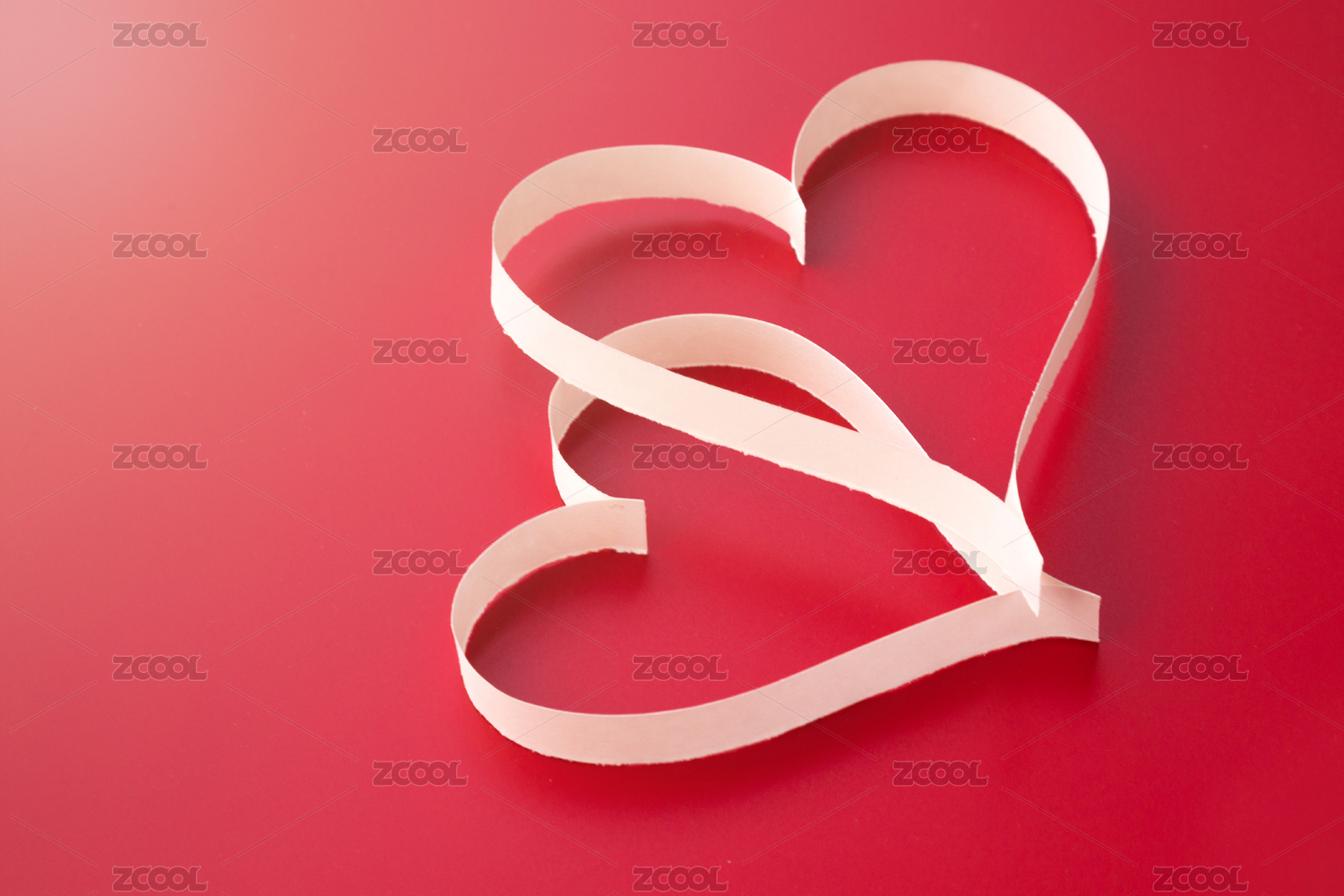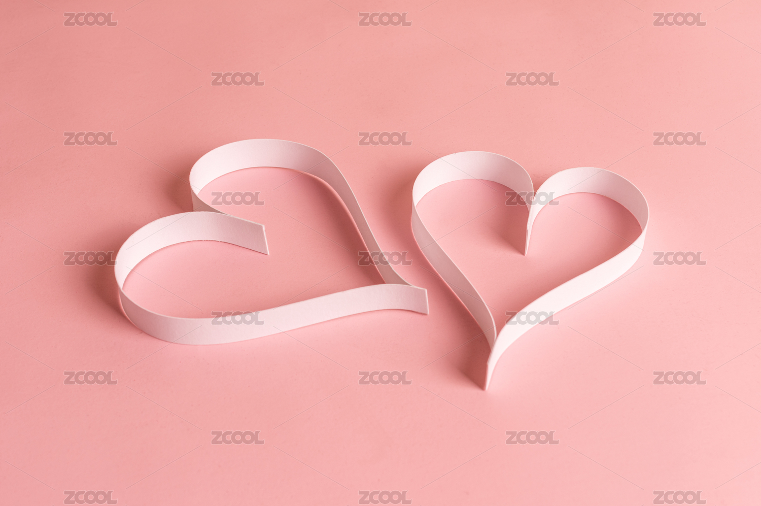 浅粉色背景上白色纸条折叠成的爱心图案