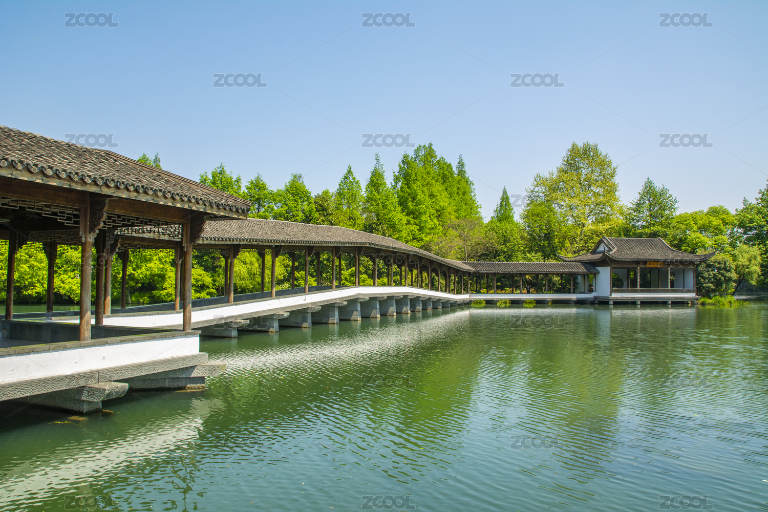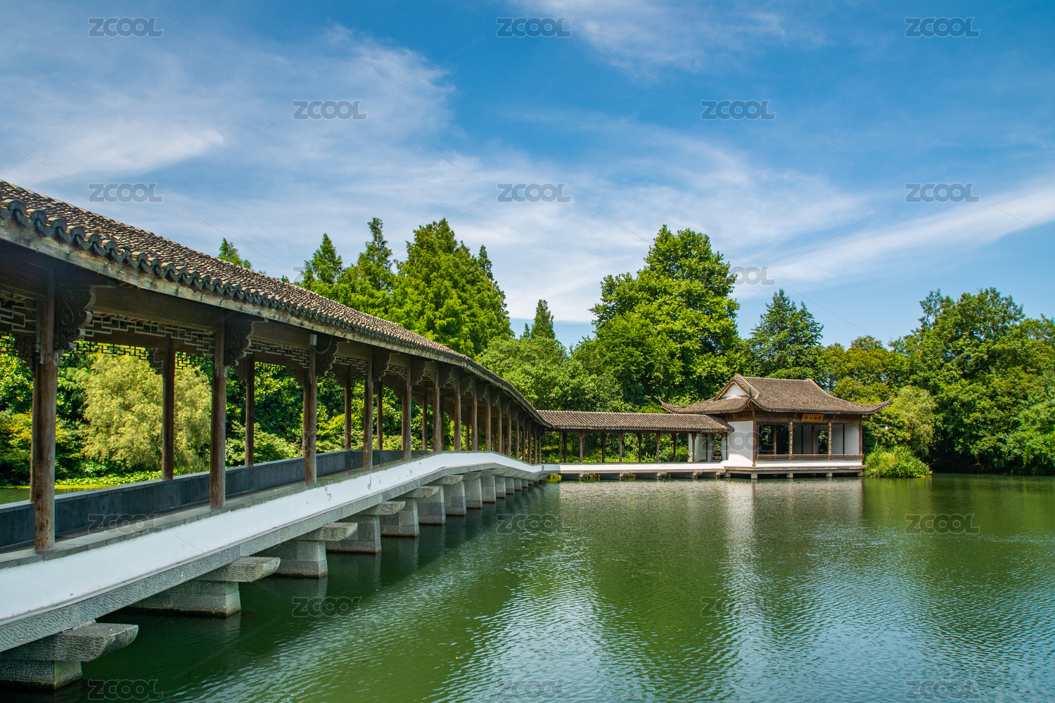 中国浙江杭州西湖景区,浴鹄湾公园的中式长廊飞虹廊