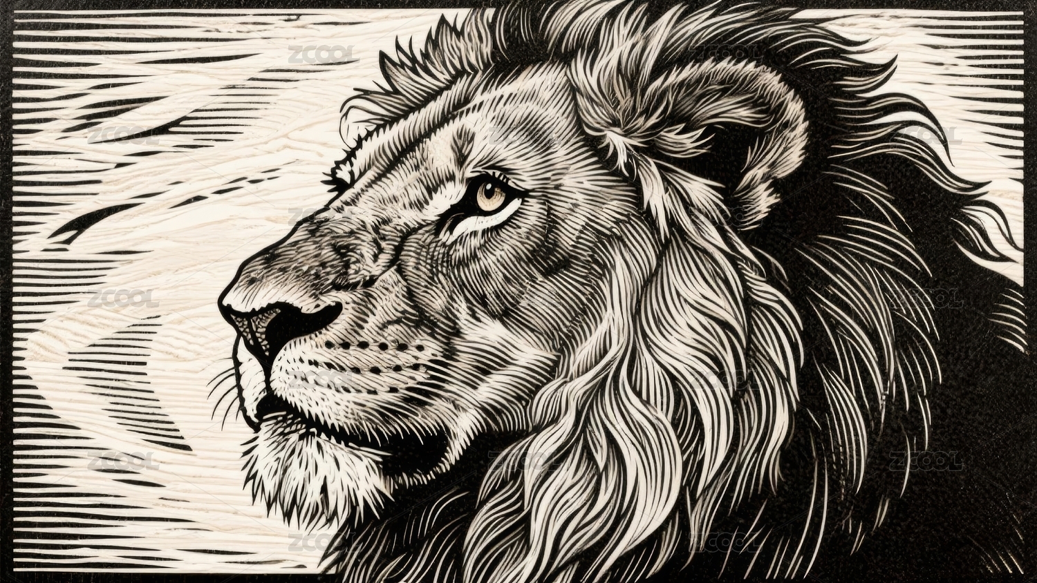 黑色背景狮子头部头像兽王复古插画