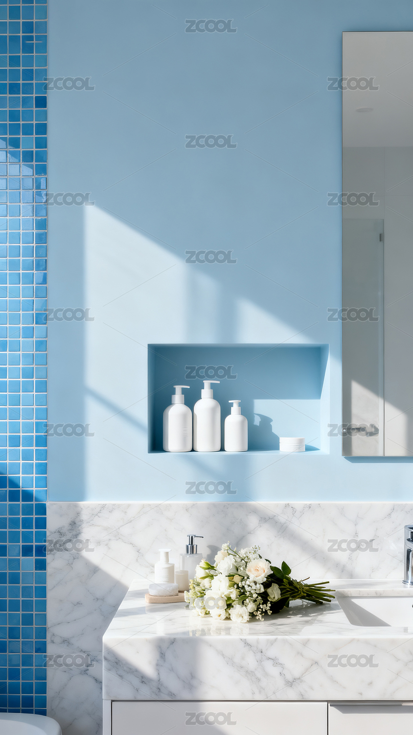 蓝色调浴室洗手台特写