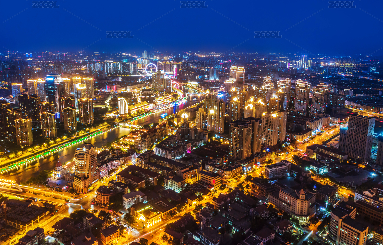 航拍天津城市建筑夜景