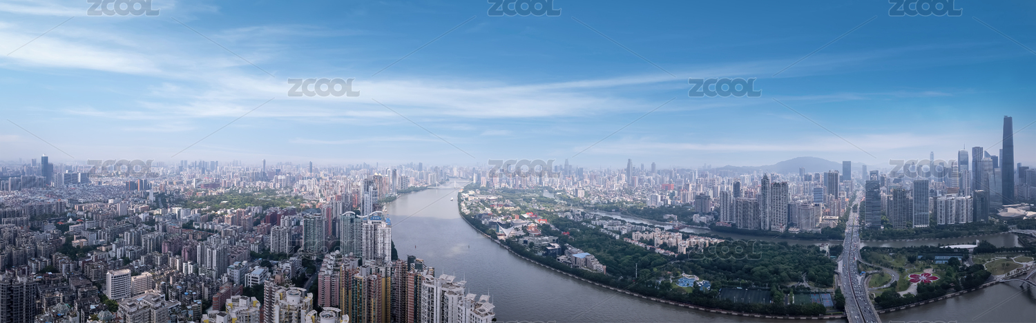 广州珠江岸城市建筑群与日出云彩航拍长图