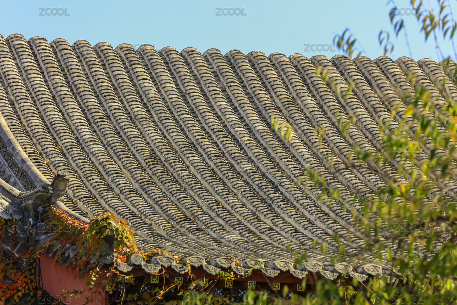 夕阳映照下秋天的黄叶与中国传统瓦房建筑