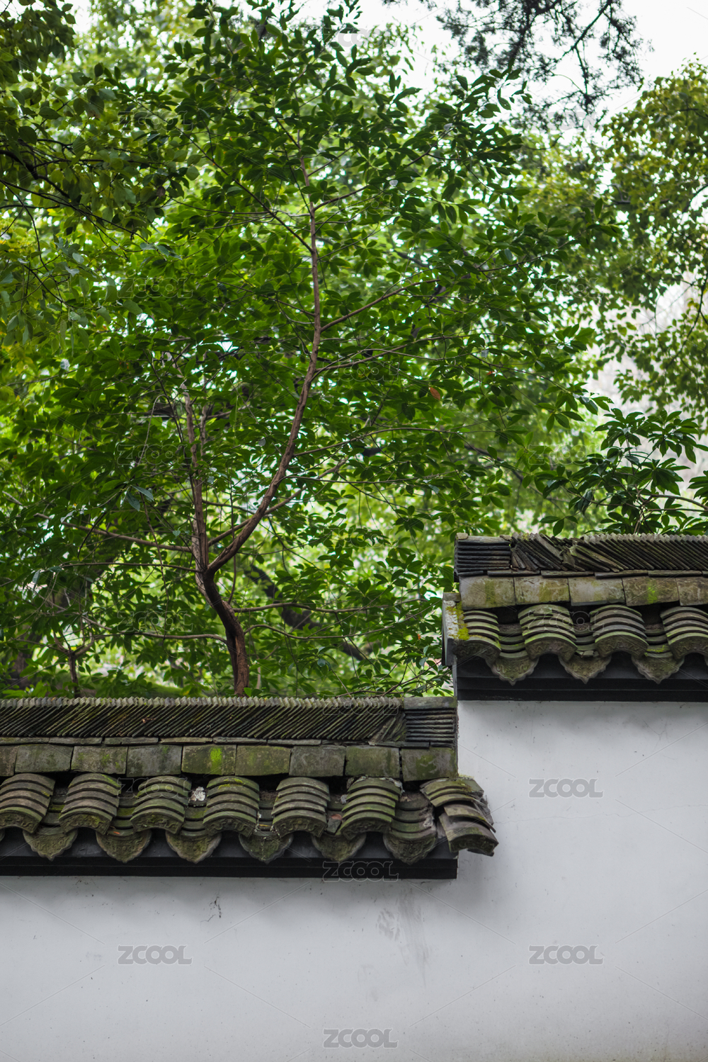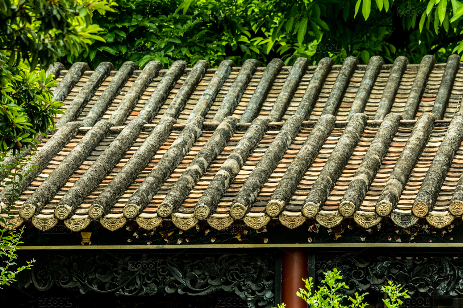 成都杜甫草堂青苔覆盖古建筑屋檐和银杏树
