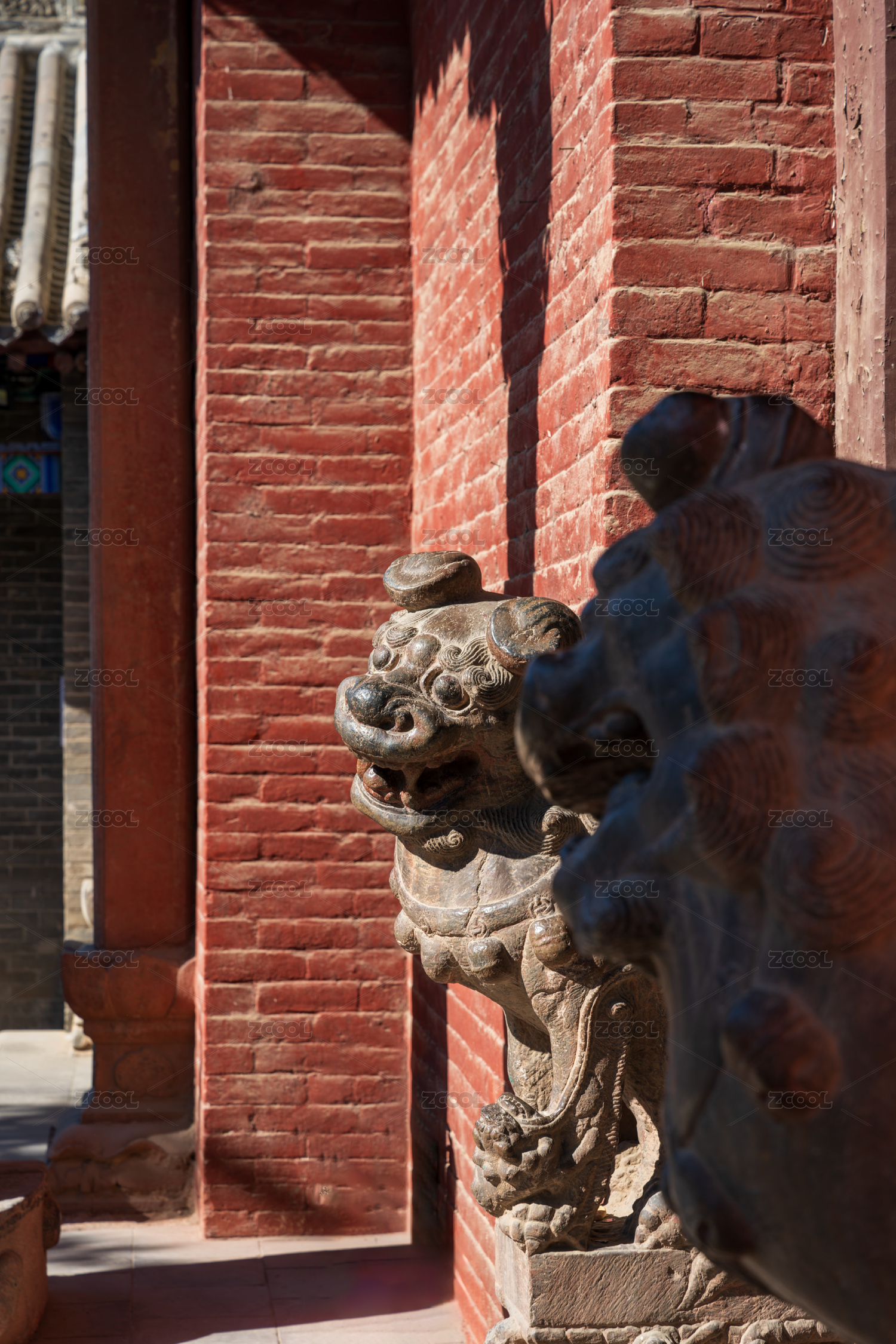 山西晋城府城关帝庙红墙旁的宋代石狮子特写