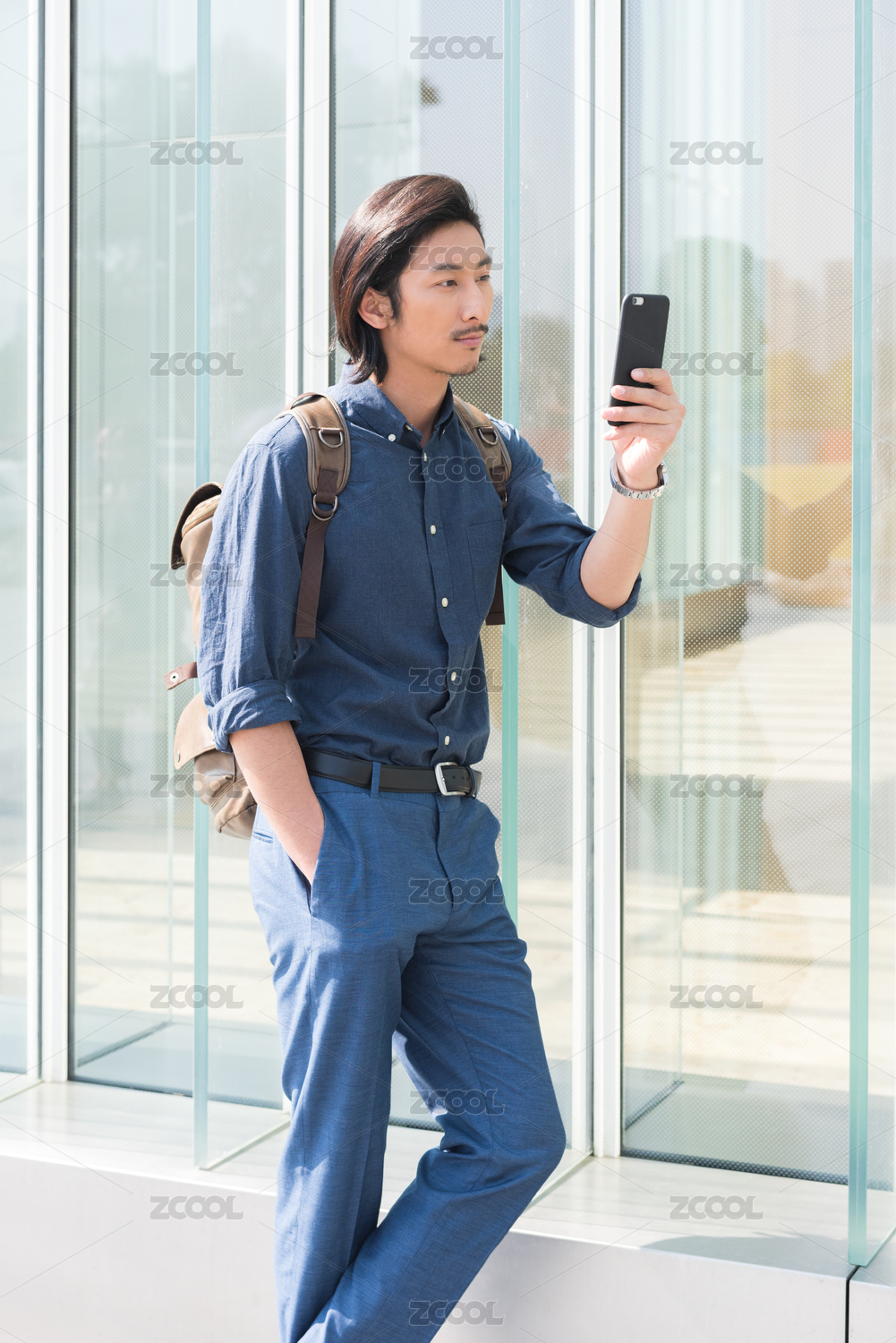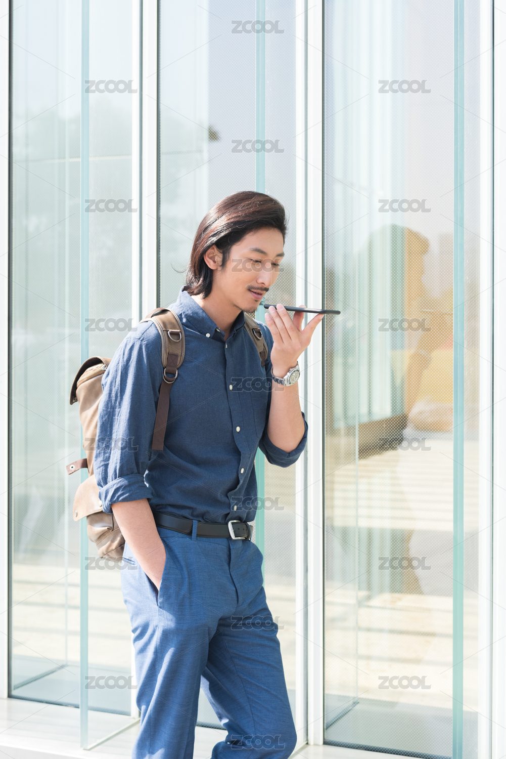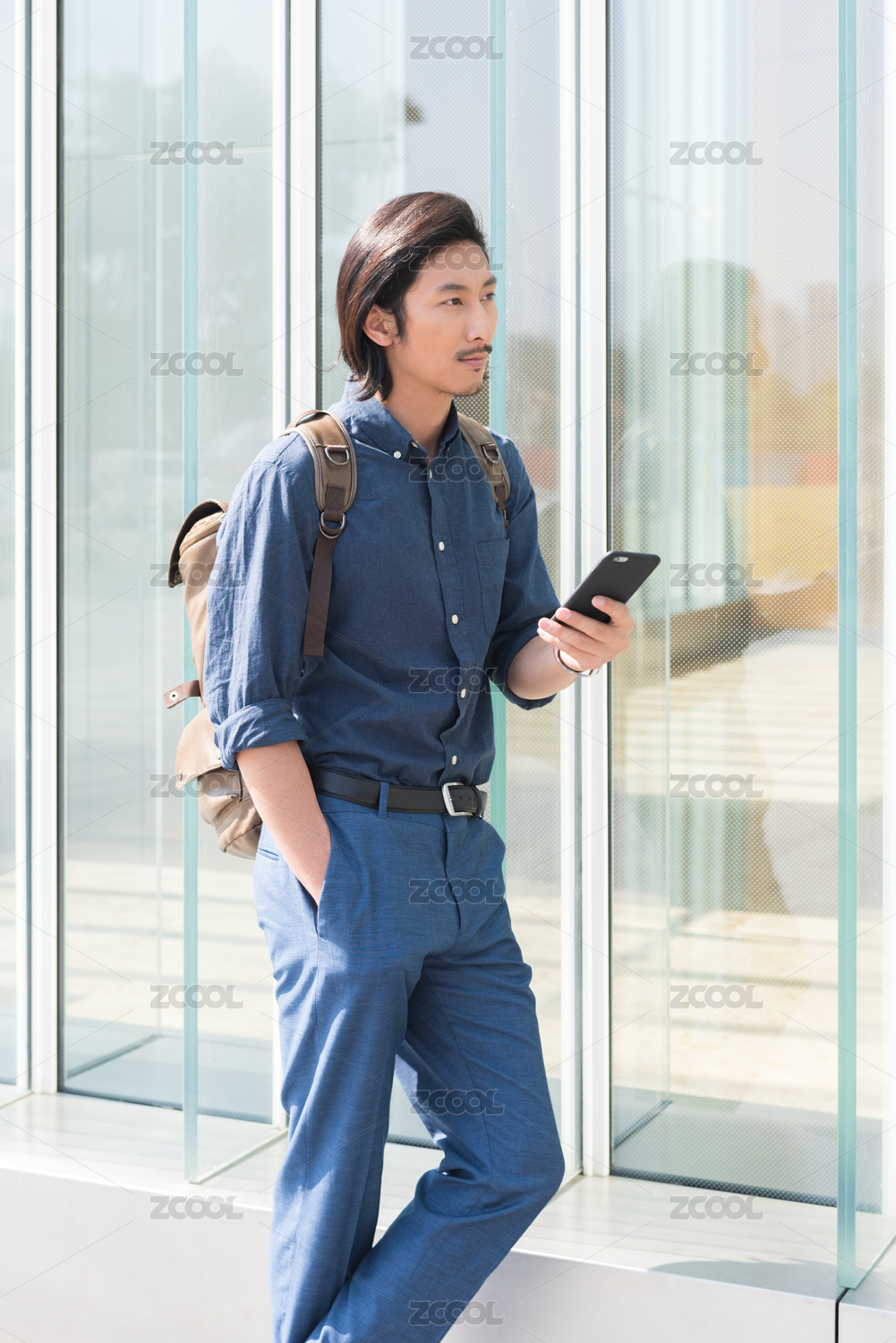 亚裔商务男士在写字楼玻璃窗旁使用手机