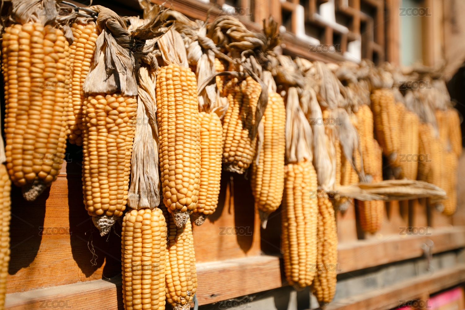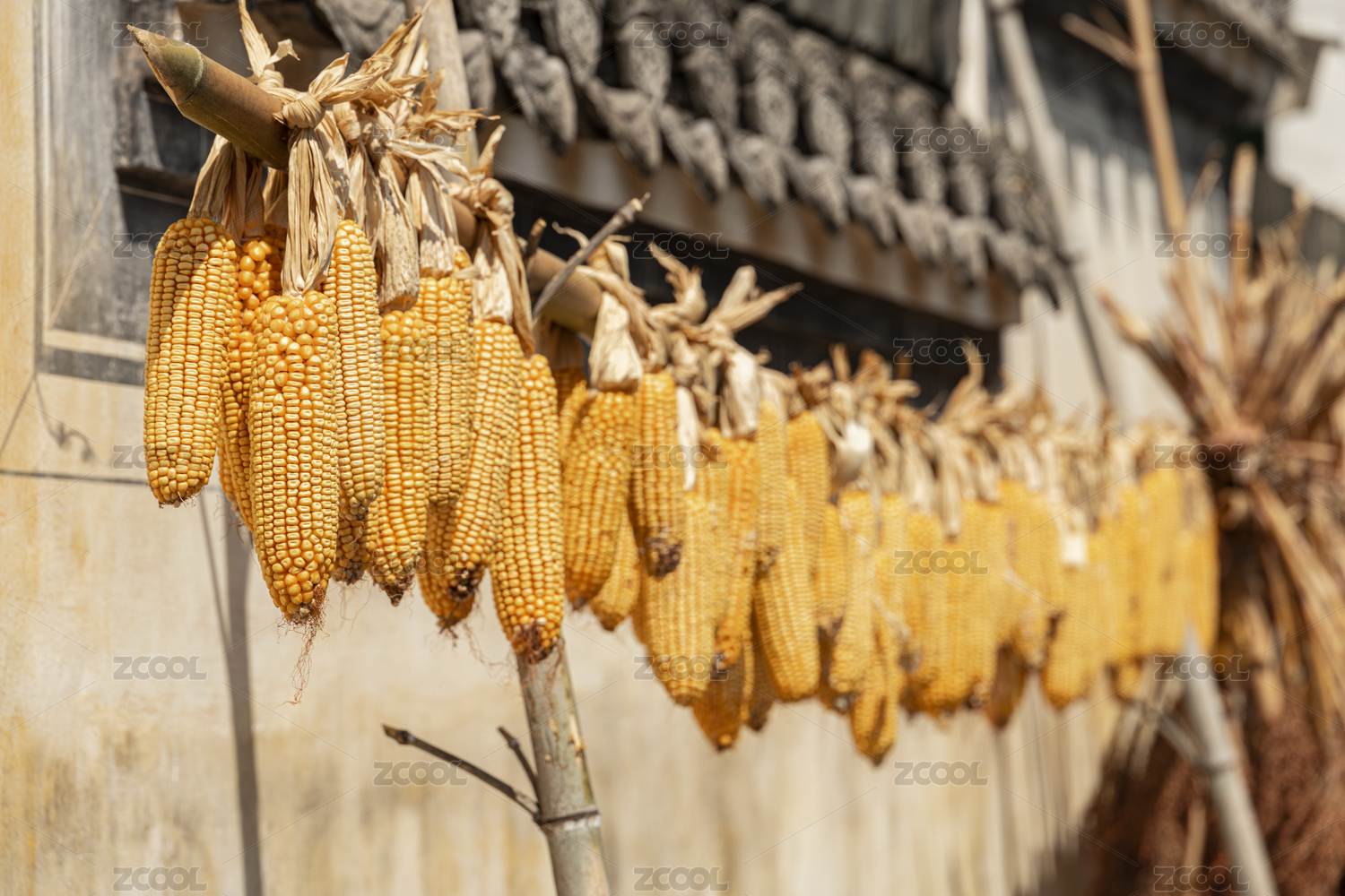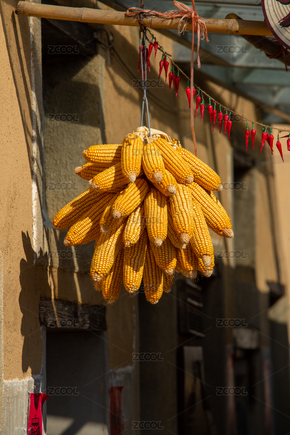 金黄饱满的玉米挂在村里的斑驳的石墙上