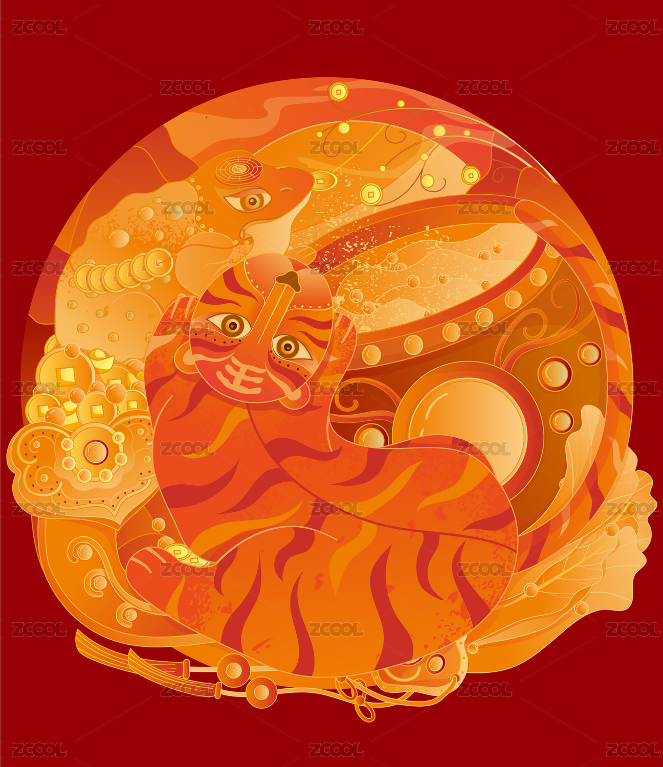 新春牛角勾住铜钱春字造型的牛年生肖插画