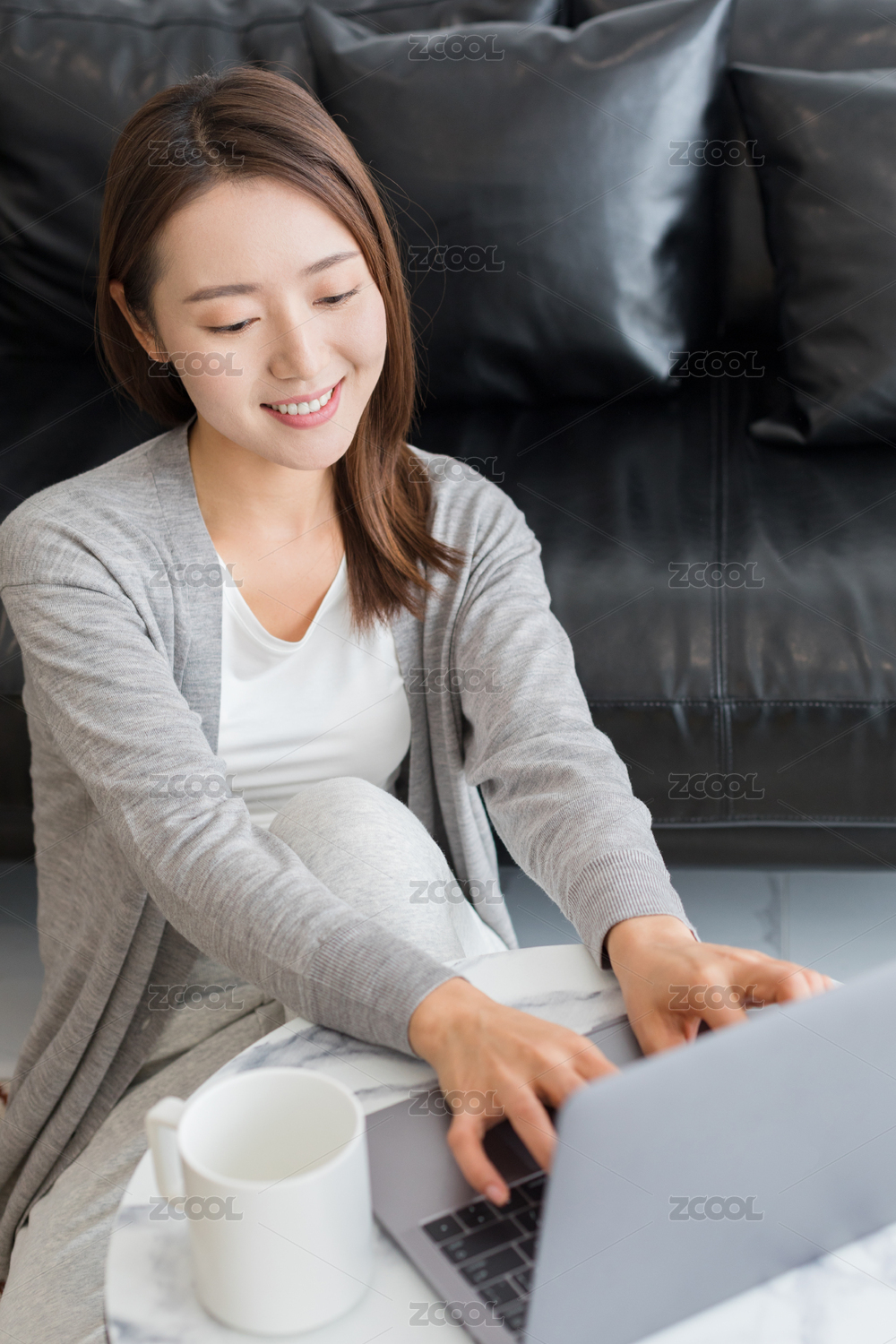 一个年轻女性在客厅微笑操作电脑使用电脑工作