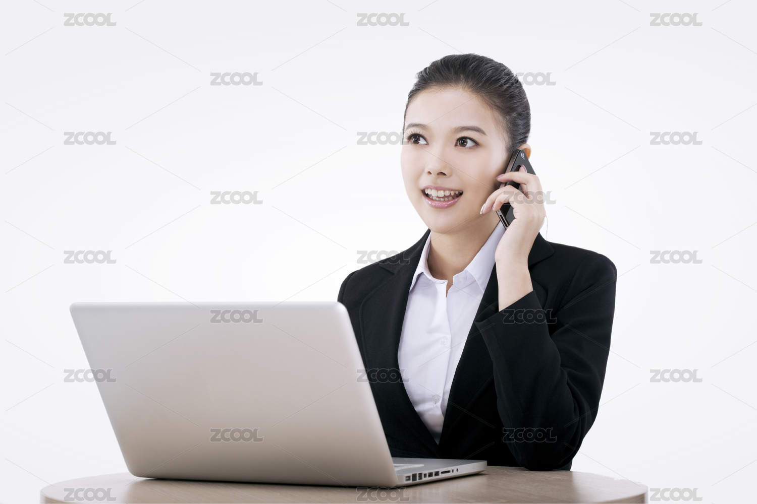 业务亚洲女子面带微笑,并呼吁在手机上打字的笔记本电脑