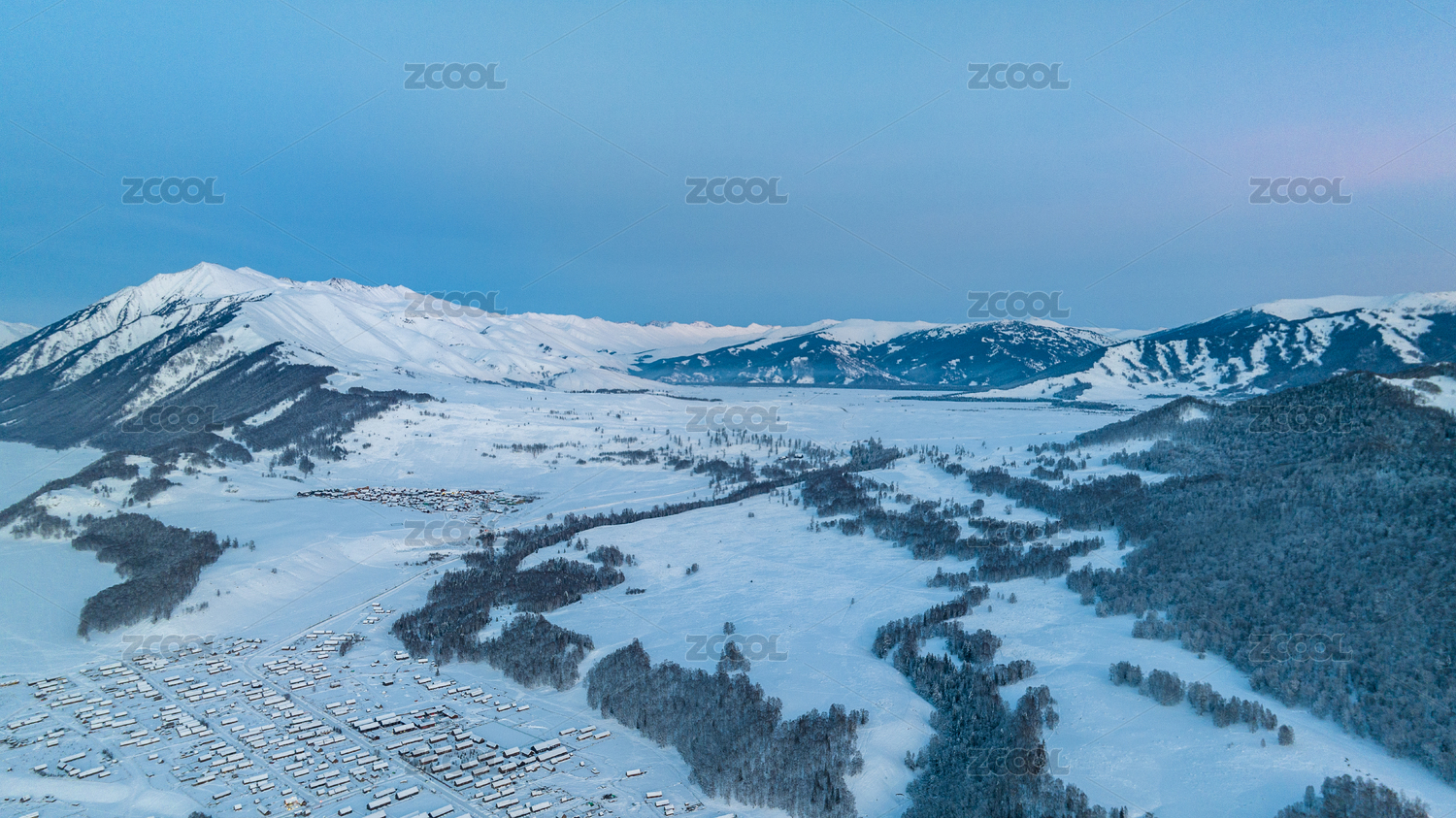 航拍中国新疆喀纳斯景区换乘中心雪景