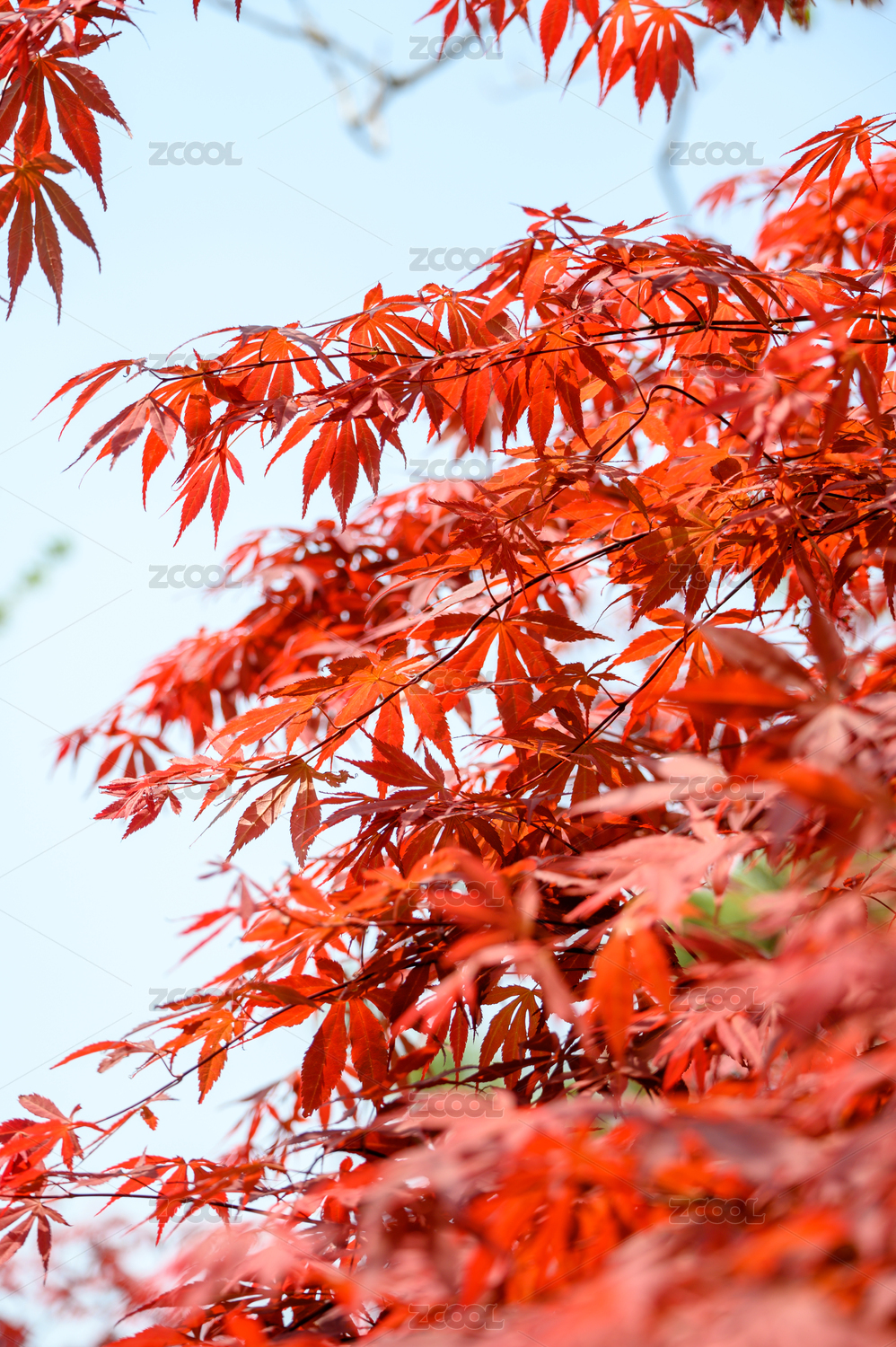 阳光红枫叶蓝天背景