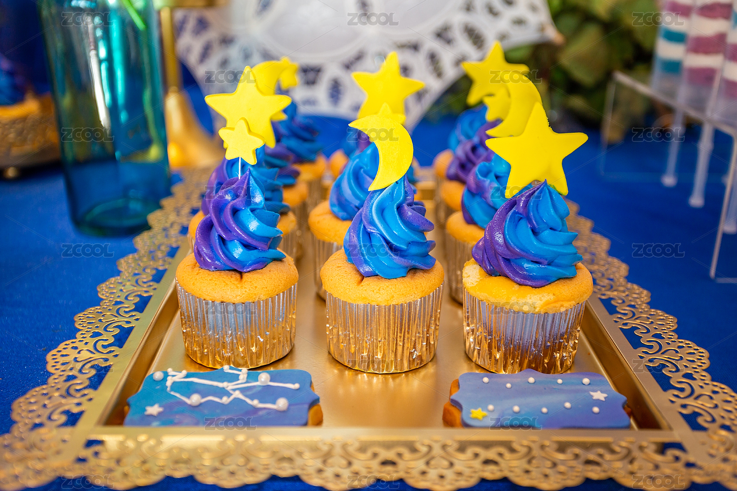 金色托盘里摆放着蓝色系杯子蛋糕。