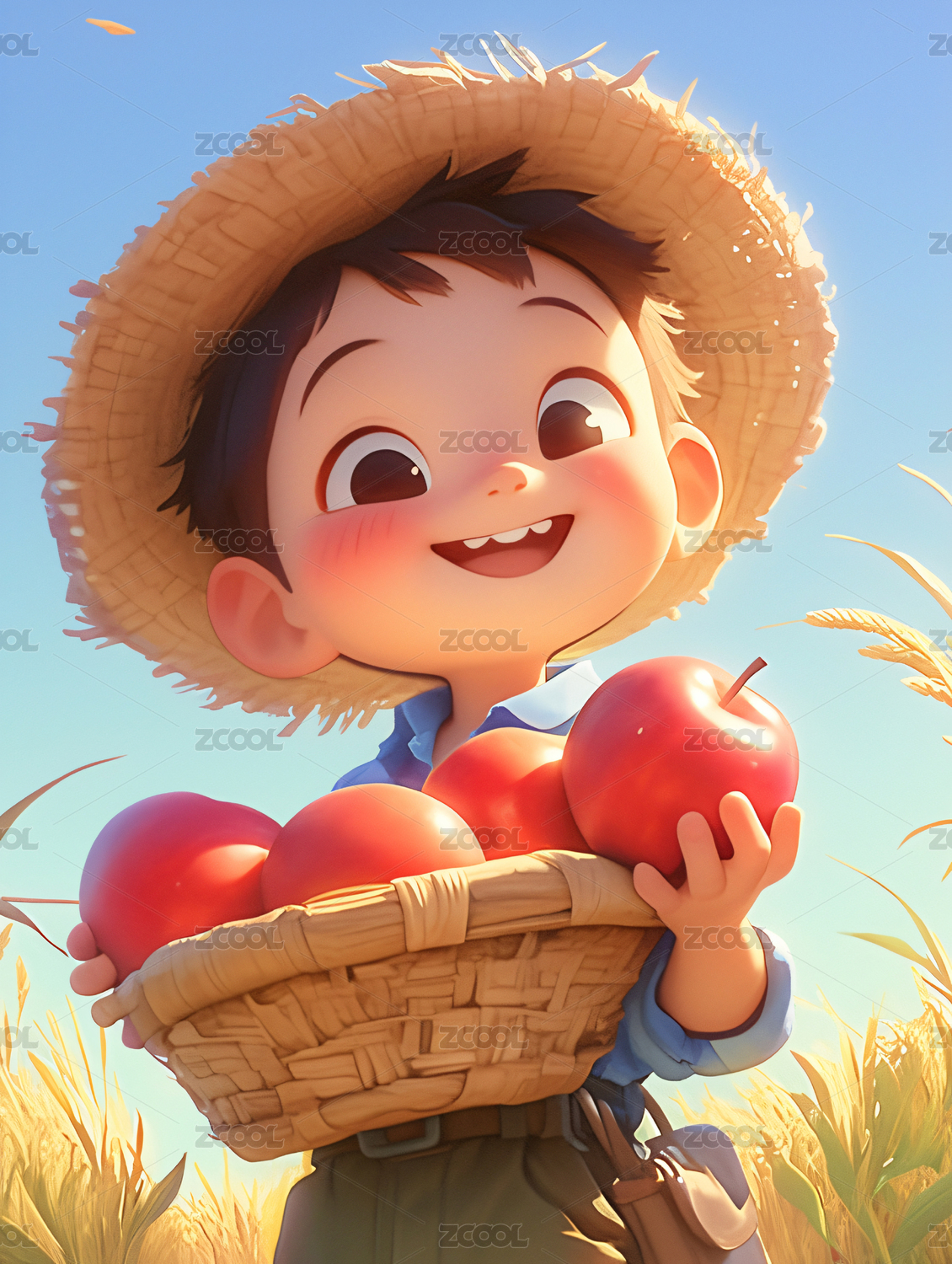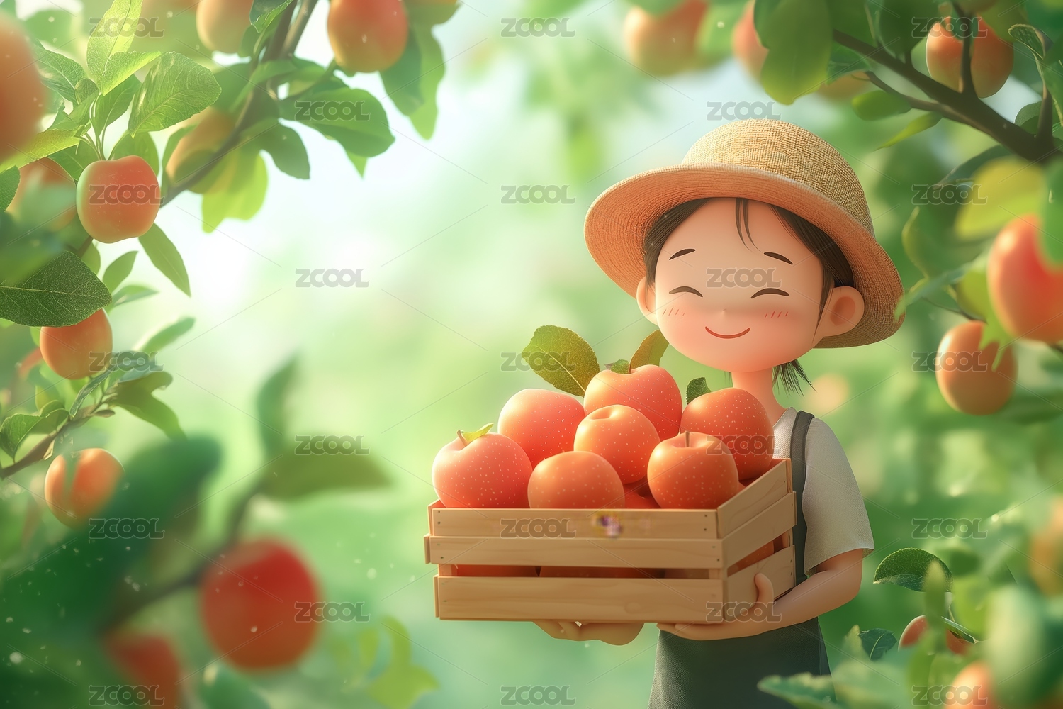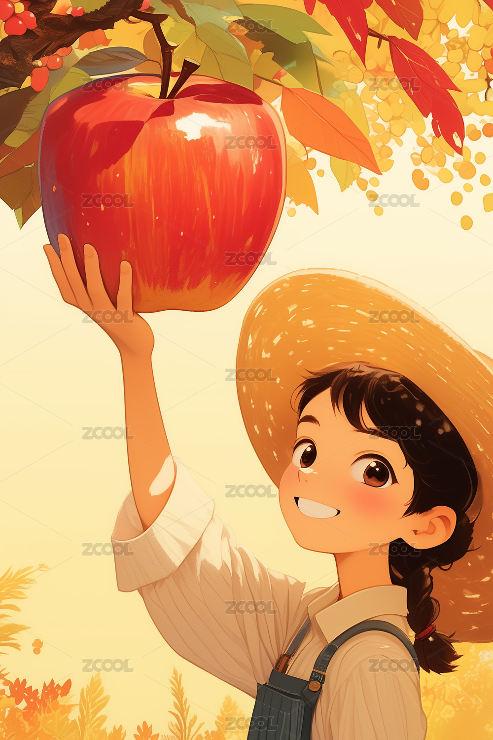 秋季明亮戴草帽手捧苹果的女孩插画绘画