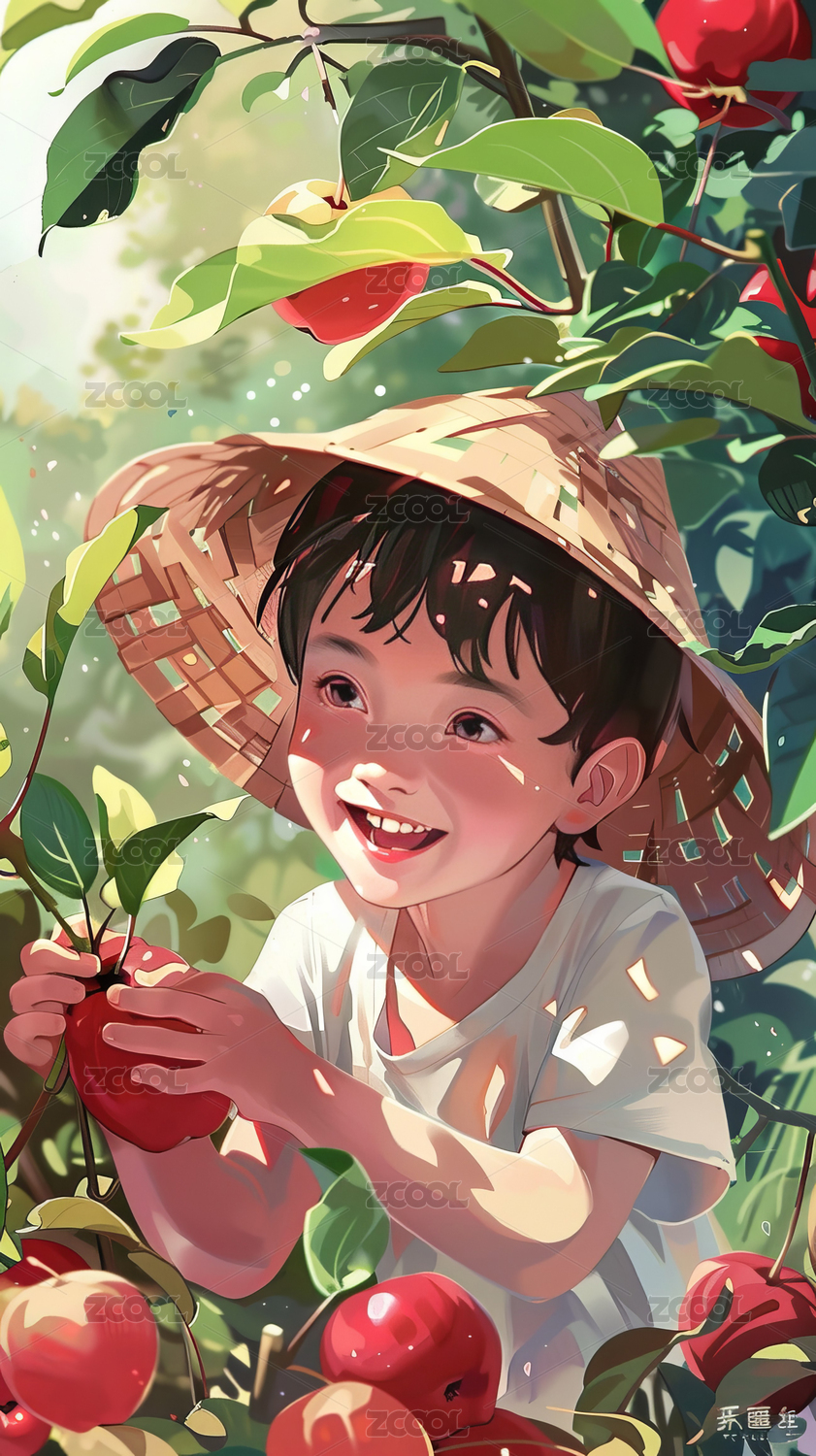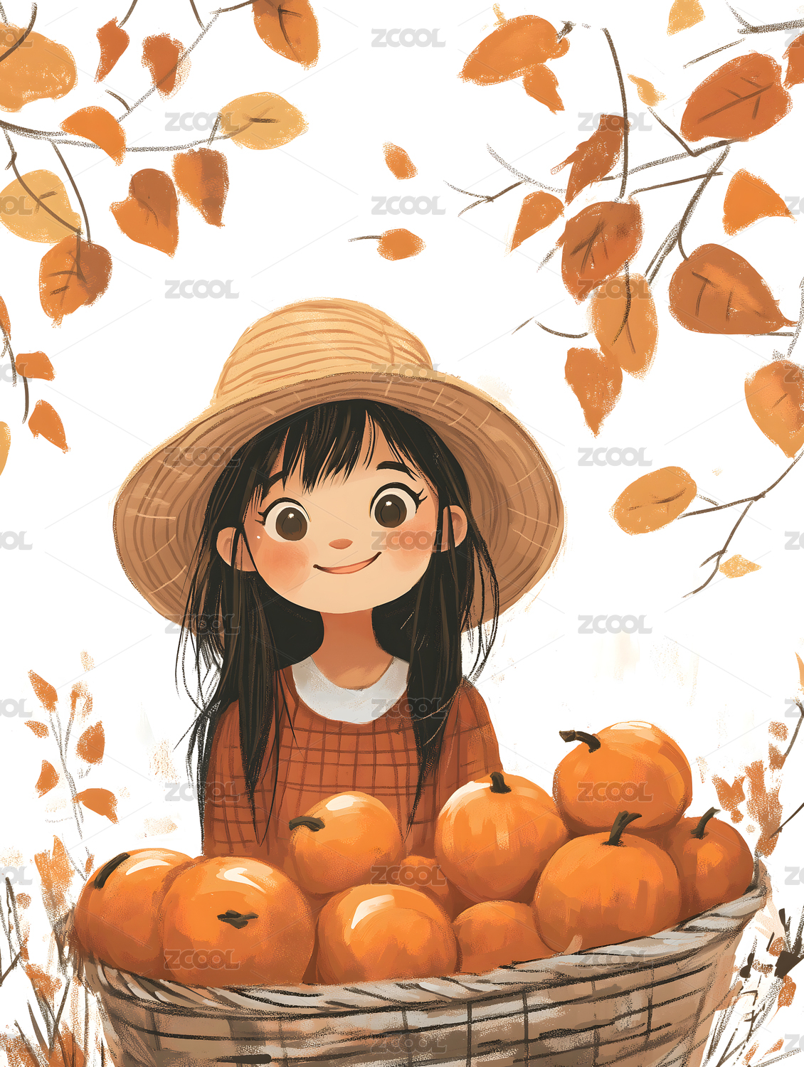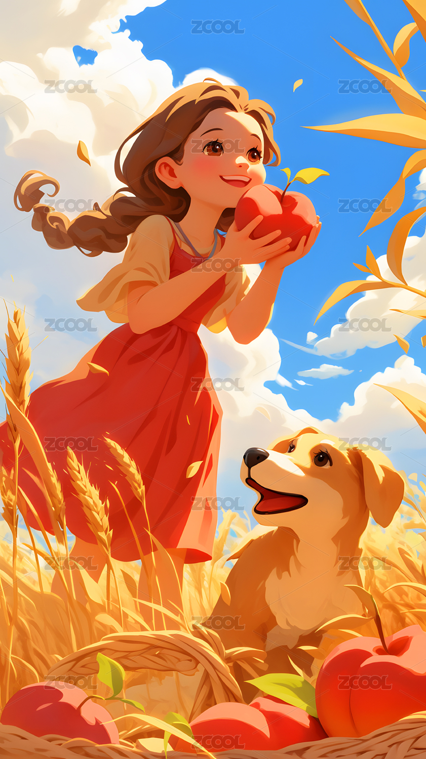 AIGC202402,秋天,秋收,女孩,卡通,插画,果实