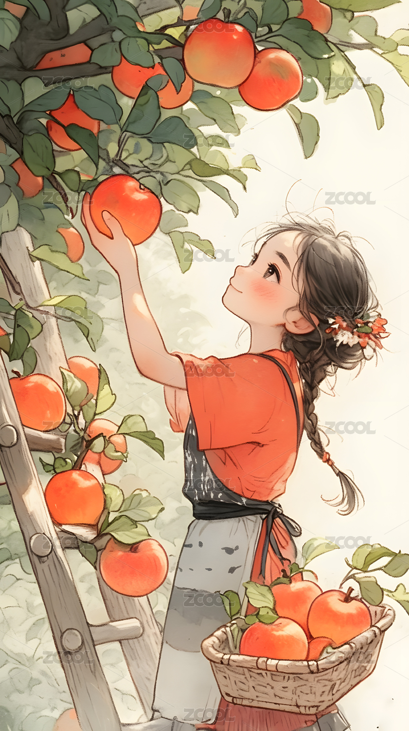 采摘苹果的人小女孩中国风插画