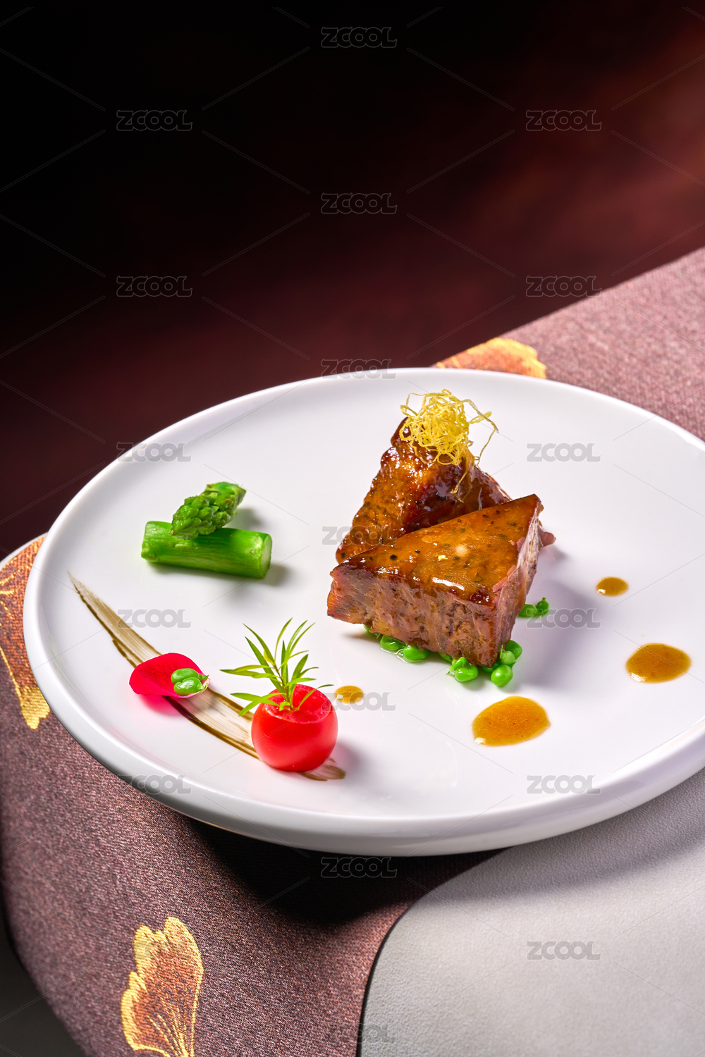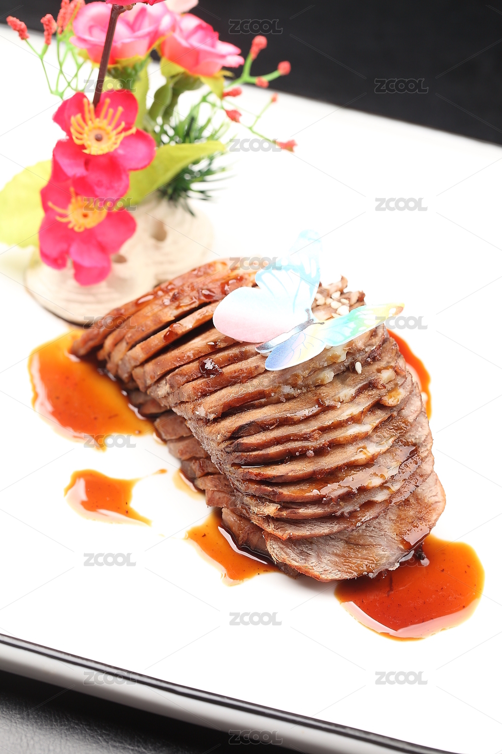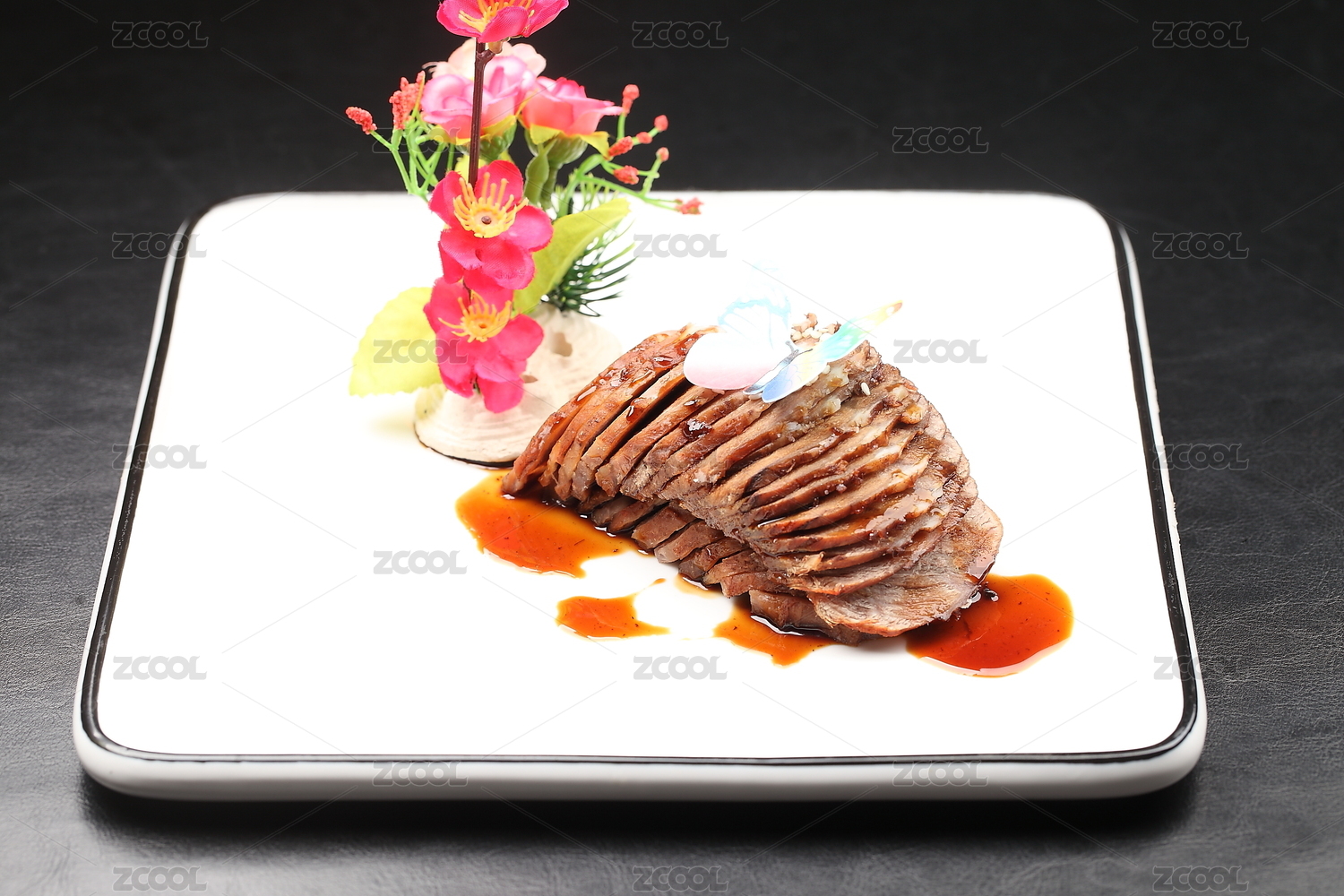 长方形白色瓷盘装的黑胡椒酱牛五花