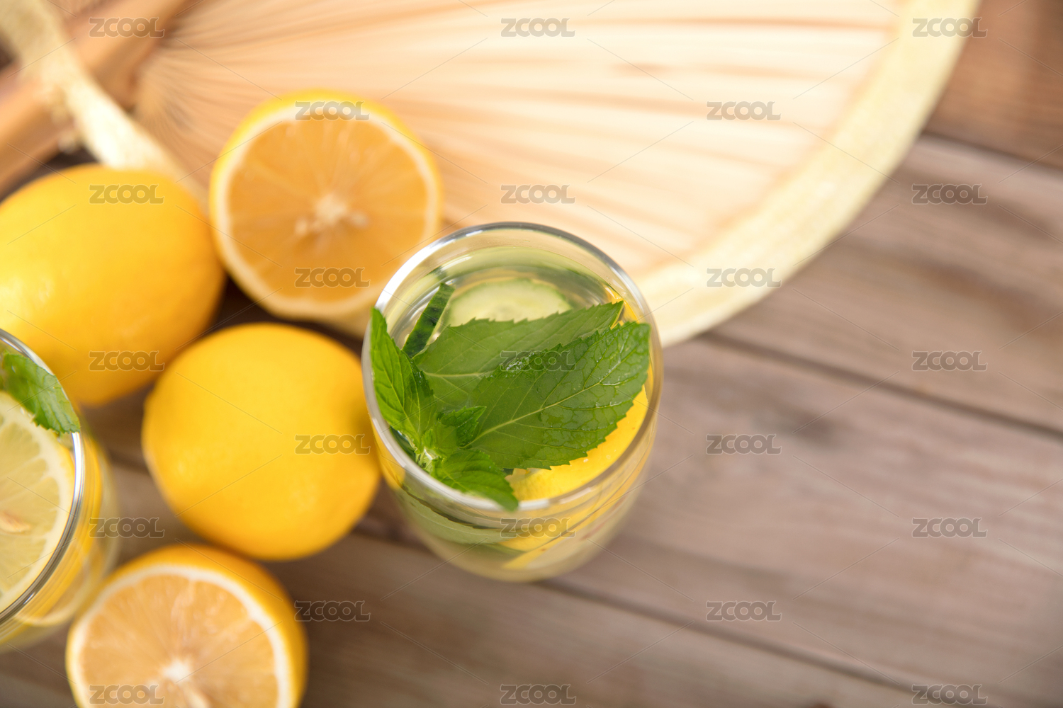 夏天的薄荷柠檬茶和一把扇子及切开的柠檬果