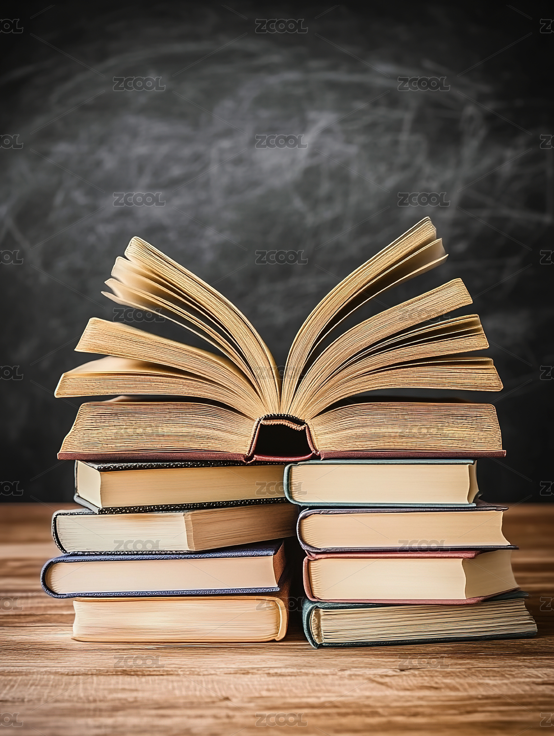黑板前一摞翻开的书籍