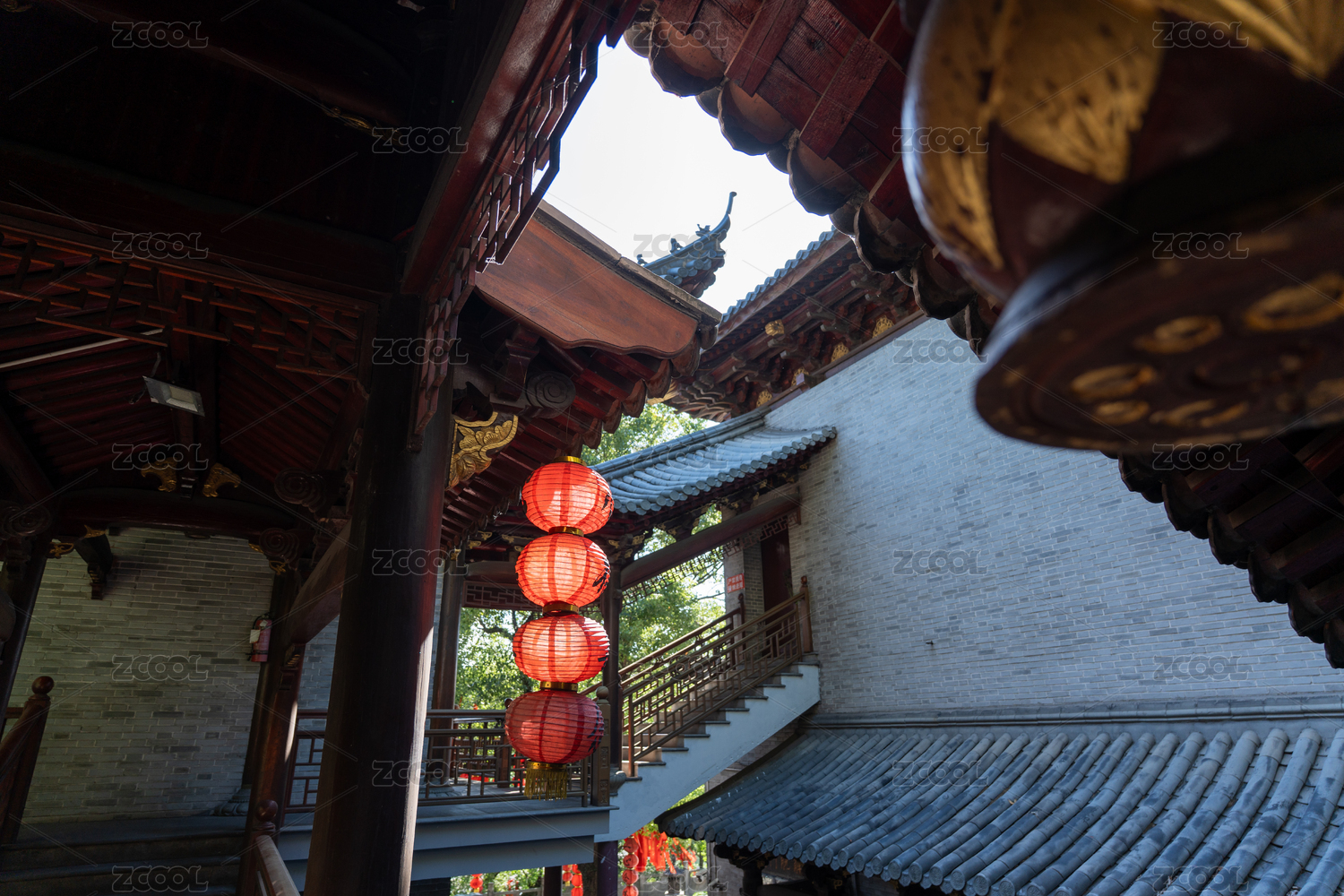 中式飞檐斗拱式木结构建筑上挂着红色灯笼