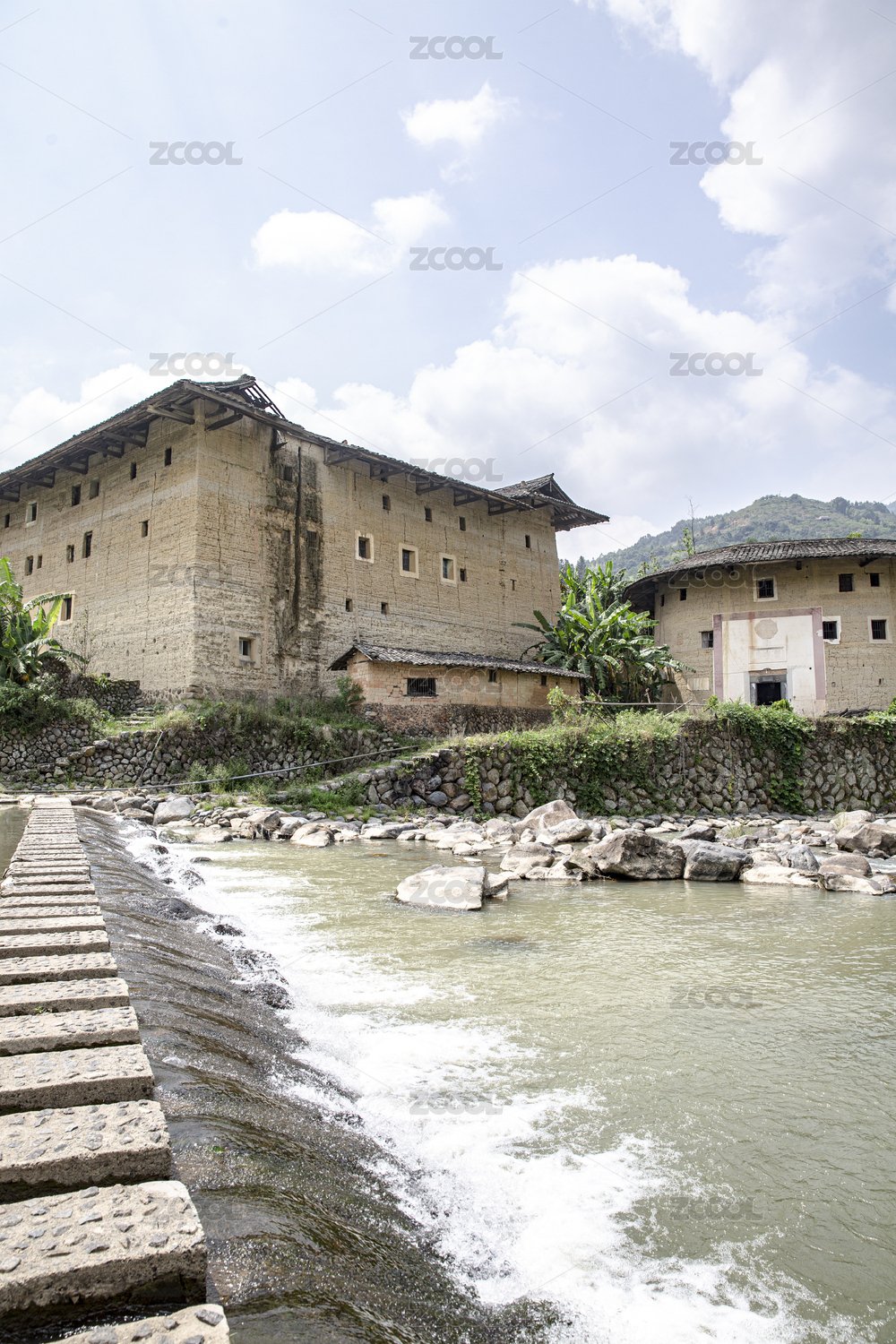 中国福建省漳州市南靖县客家传统土楼建筑远景图