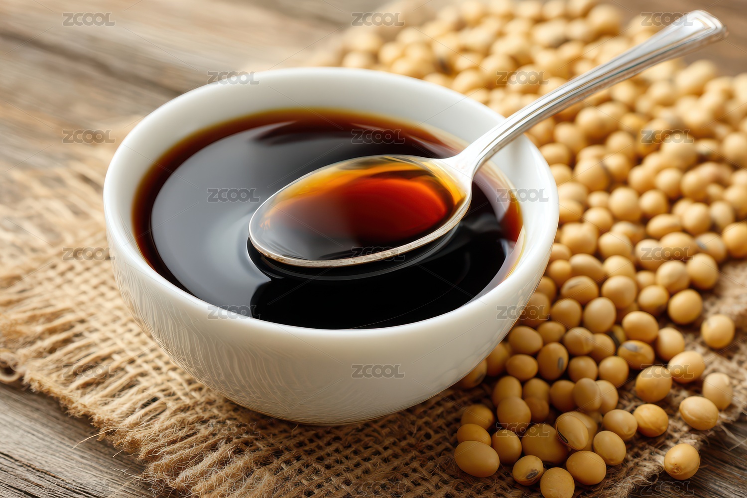 勺子中的酱油和大豆背景