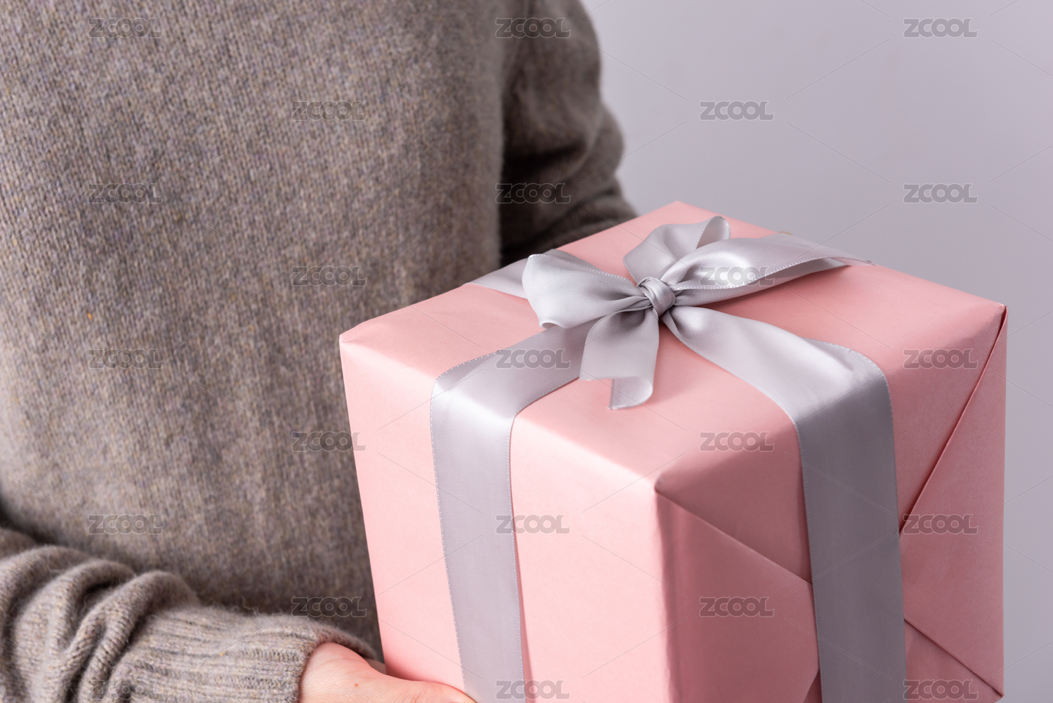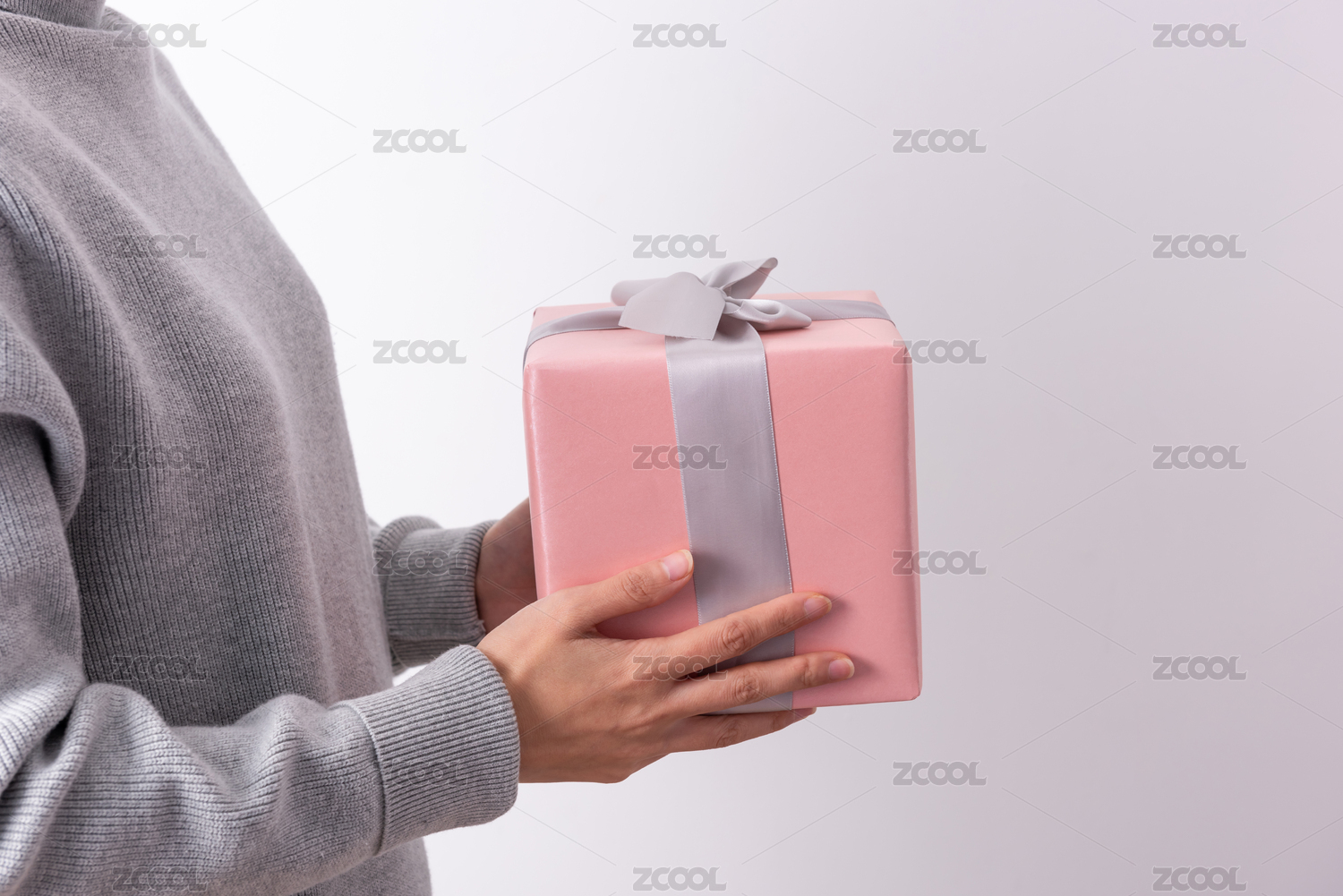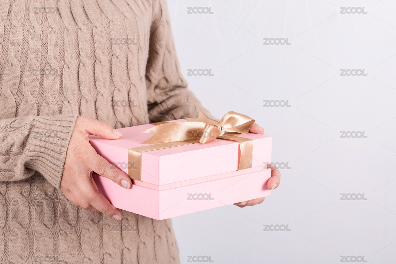 年轻的女性穿着毛衣拿着粉红色的礼物盒,特写镜头,室内白色墙壁背景