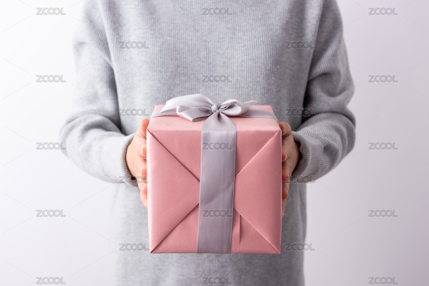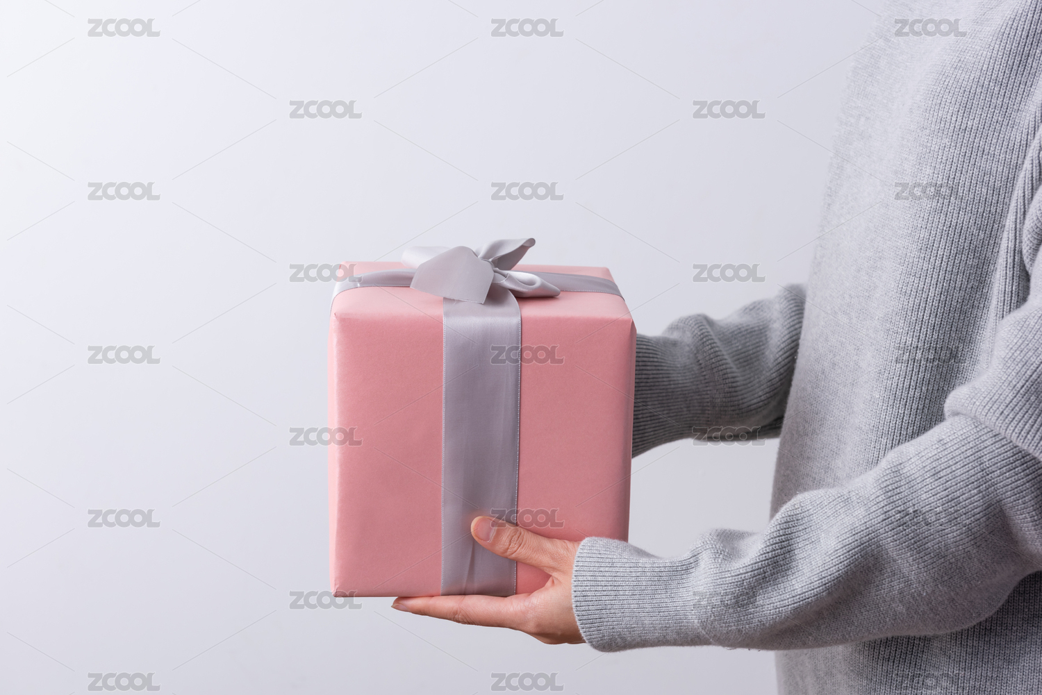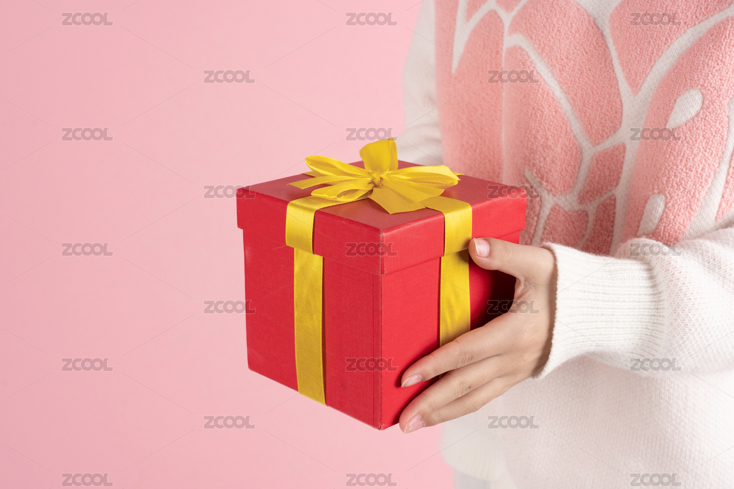年轻的女性穿着毛衣拿着粉红色的礼物盒,特写镜头,室内白色墙壁背景