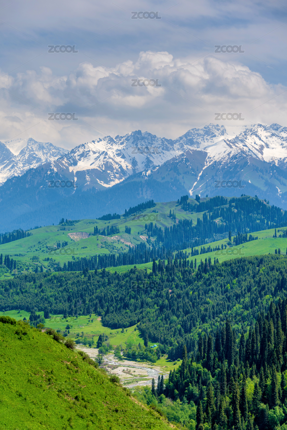 中国新疆伊犁恰西雪山森林草原风光