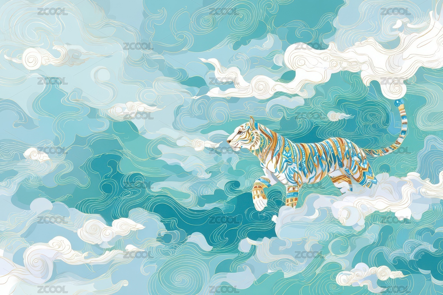 白虎站在浪潮中的高山上背后烈火燃烧国潮