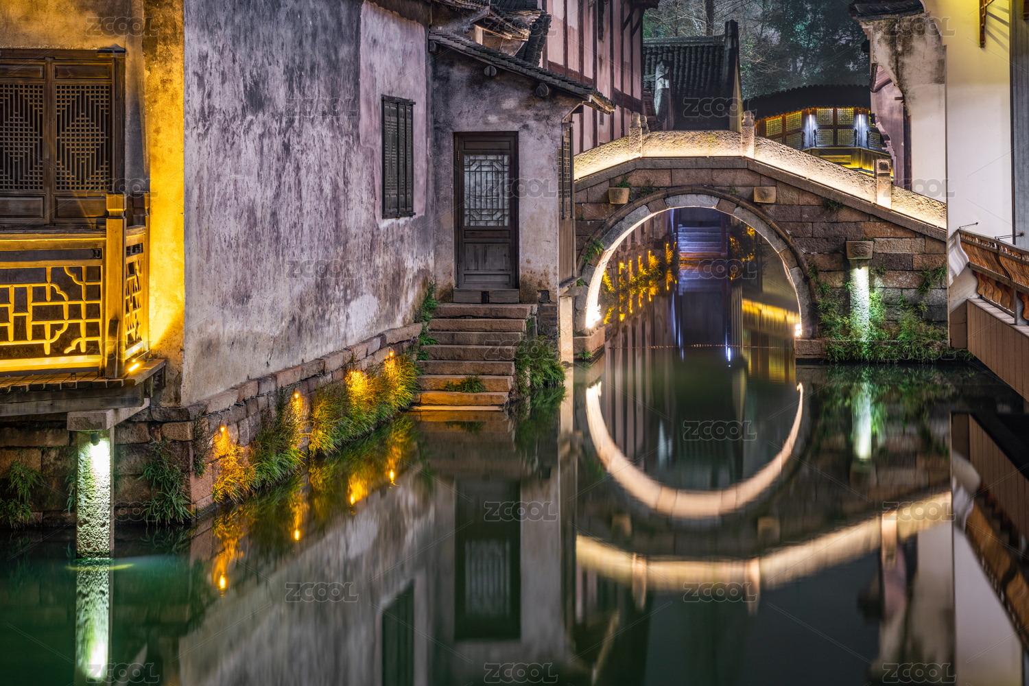 小桥流水,古镇,夜景,倒影,周庄,光,江南,晚上,拱桥,水乡