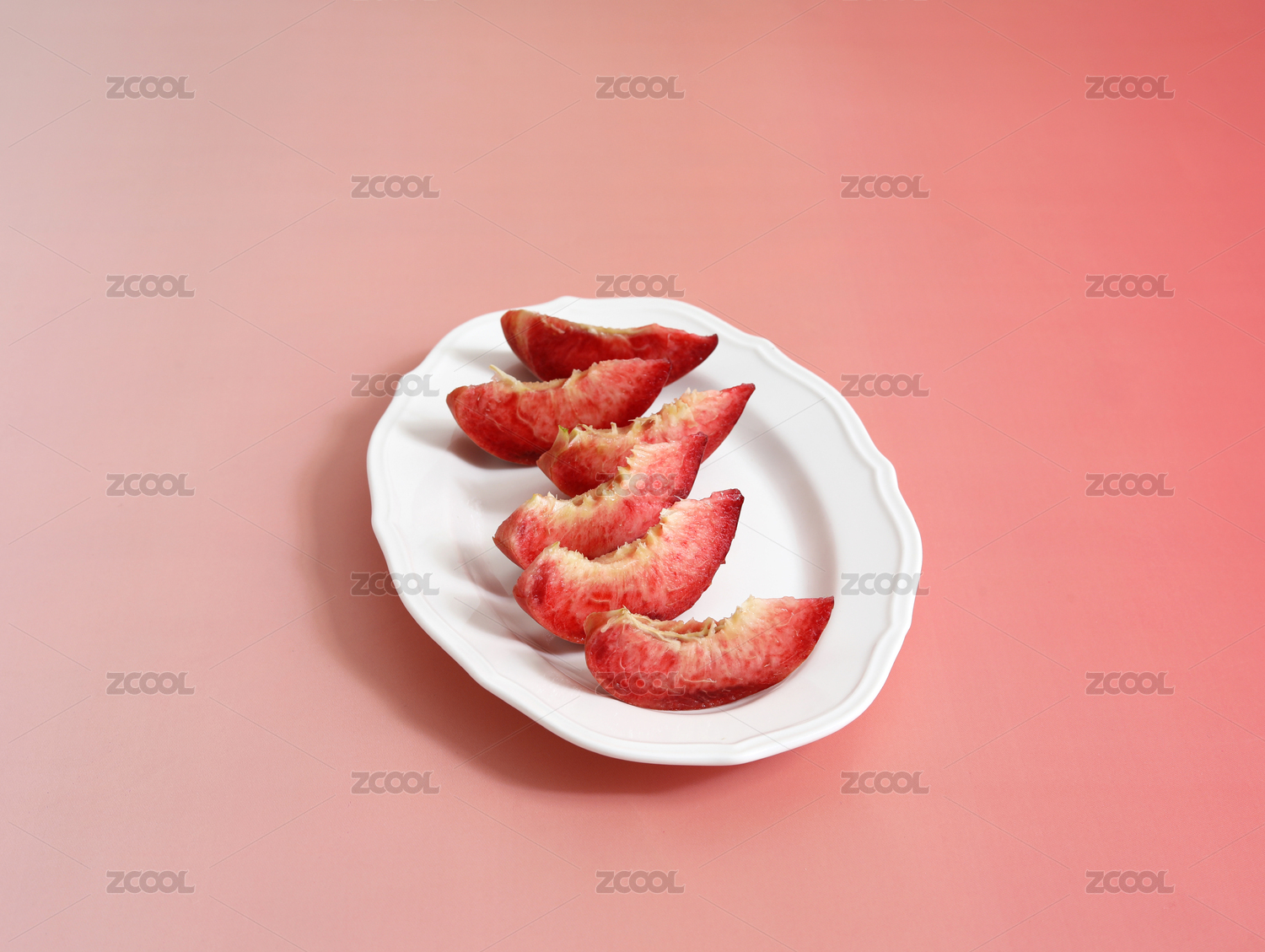 粉色桌面上一盘子切开的新鲜水果下午茶桃子