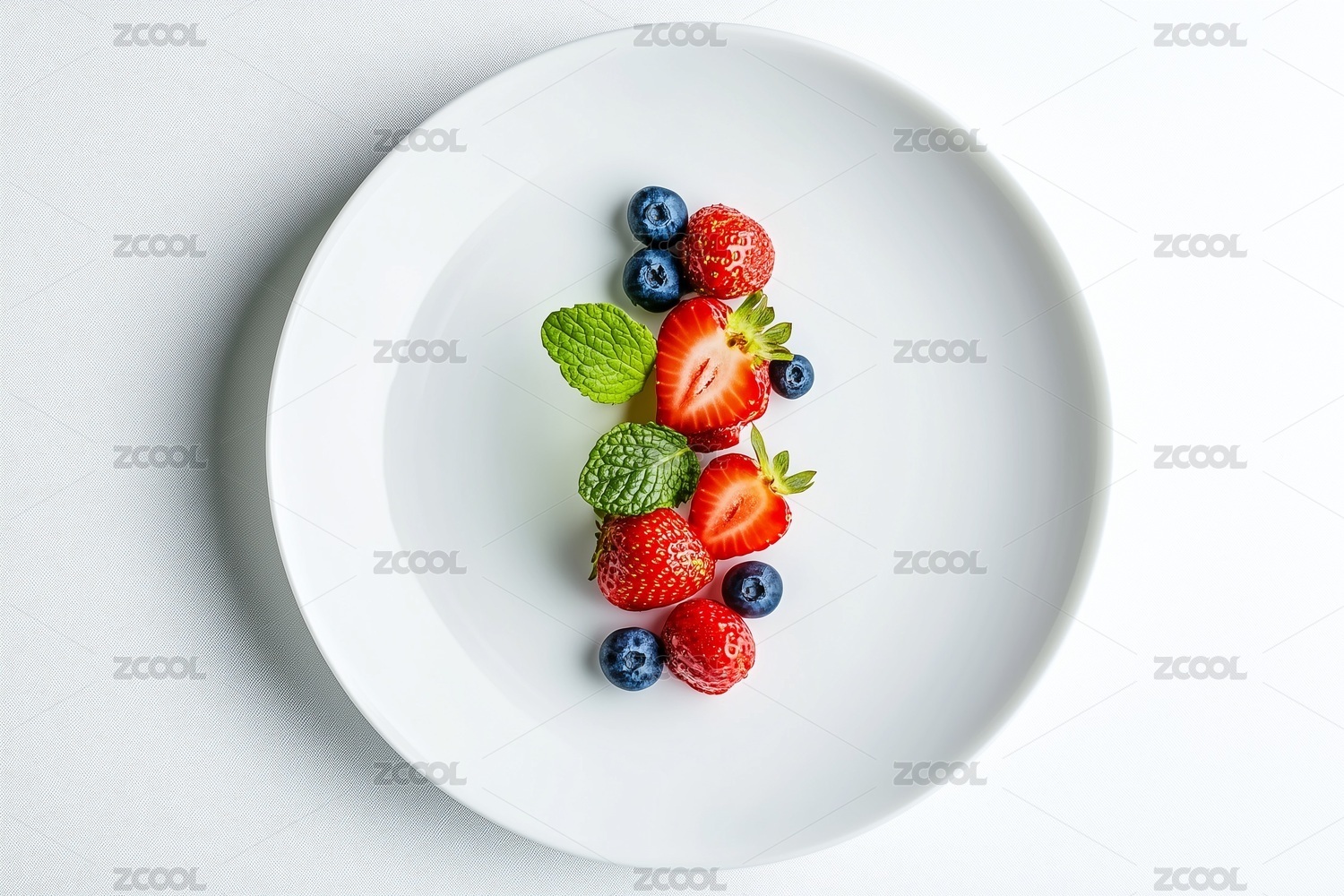 白色背景盘子木叉草莓树莓特写