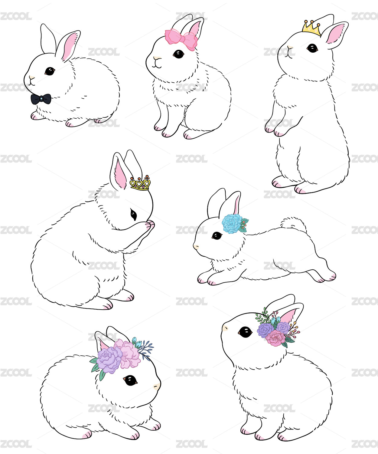 白色小兔,戴着各种花冠,或皇冠等饰品