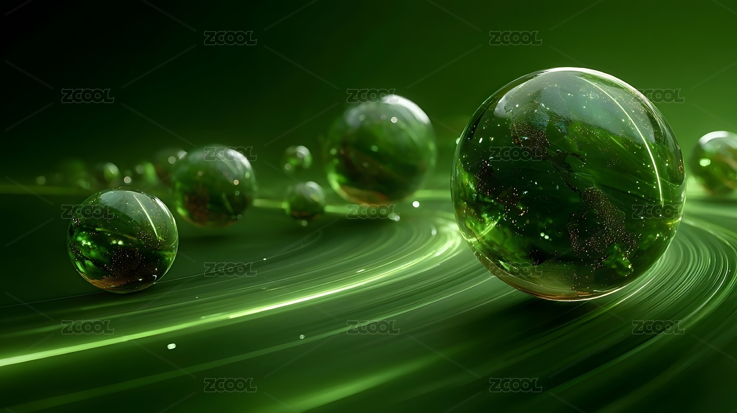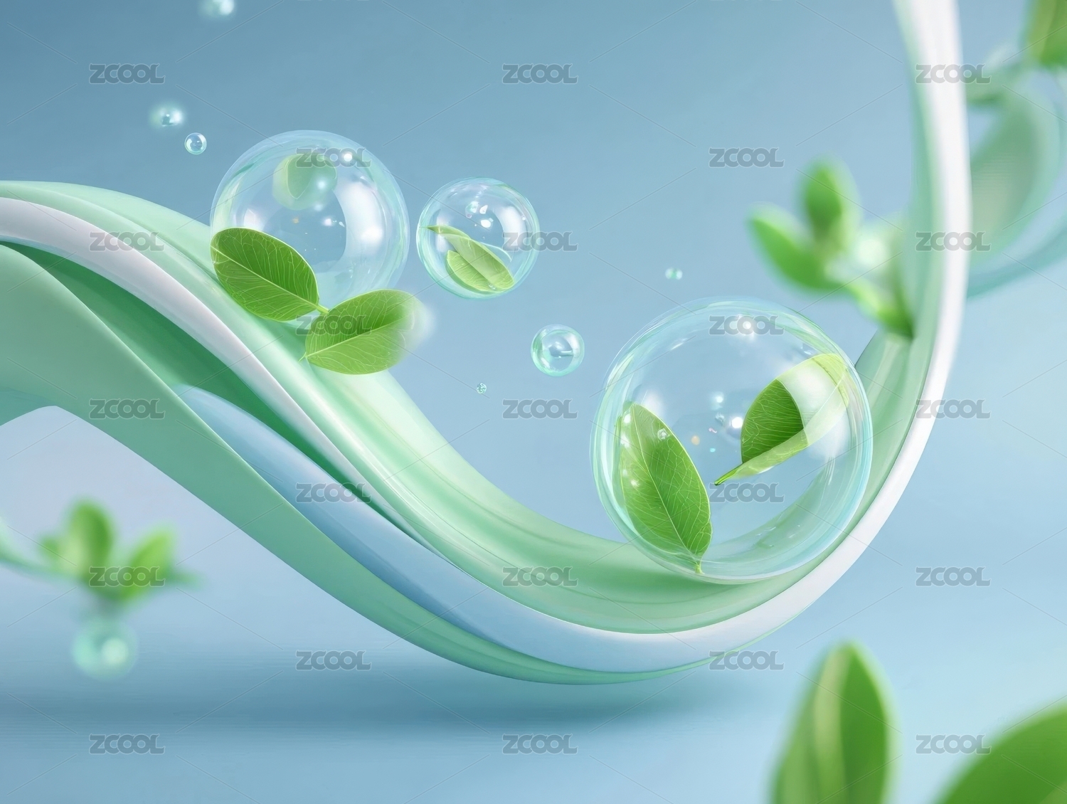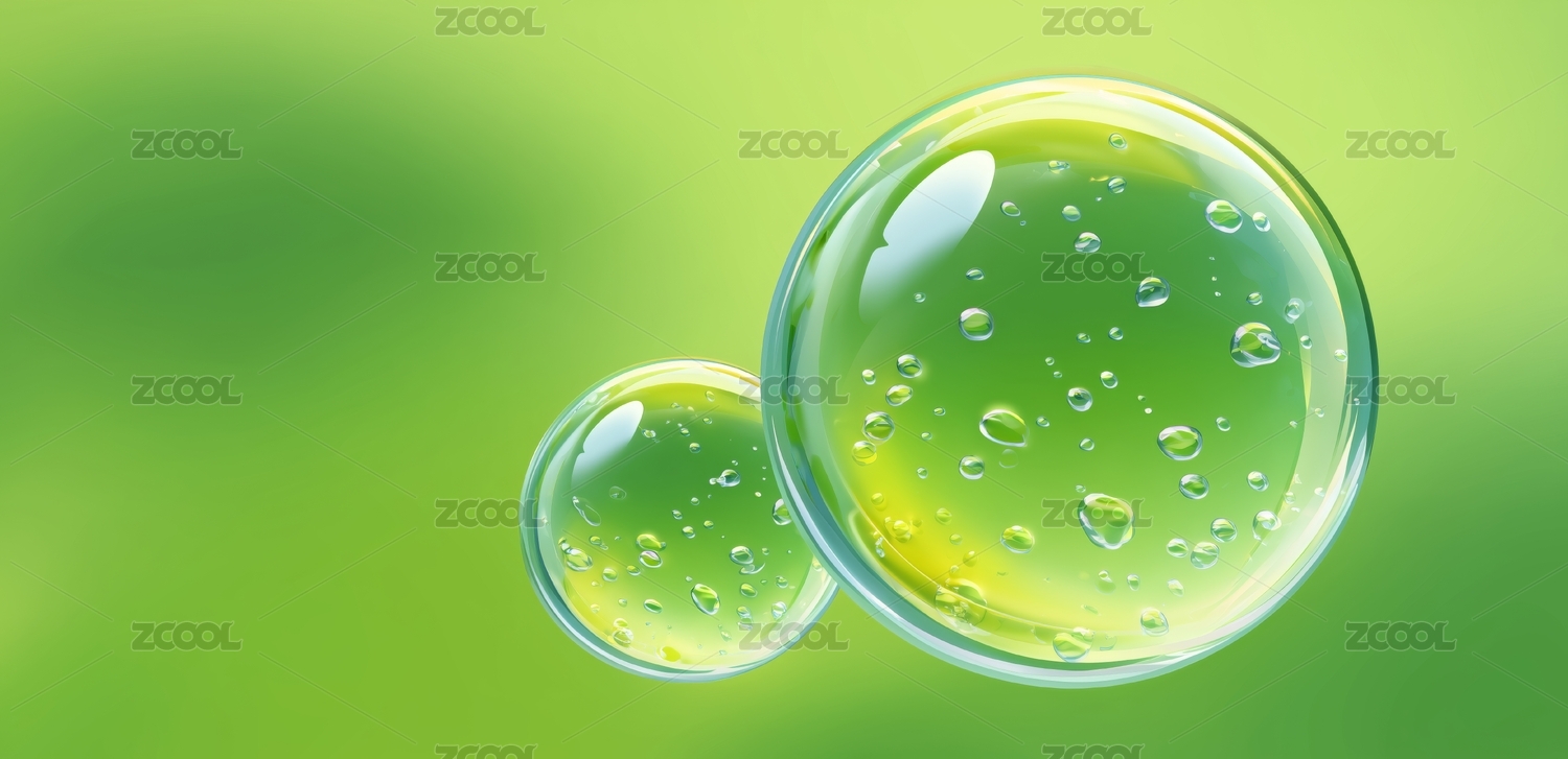 光滑水面和绿色背景中的泡泡,化妆品成分分