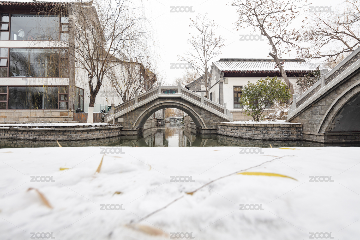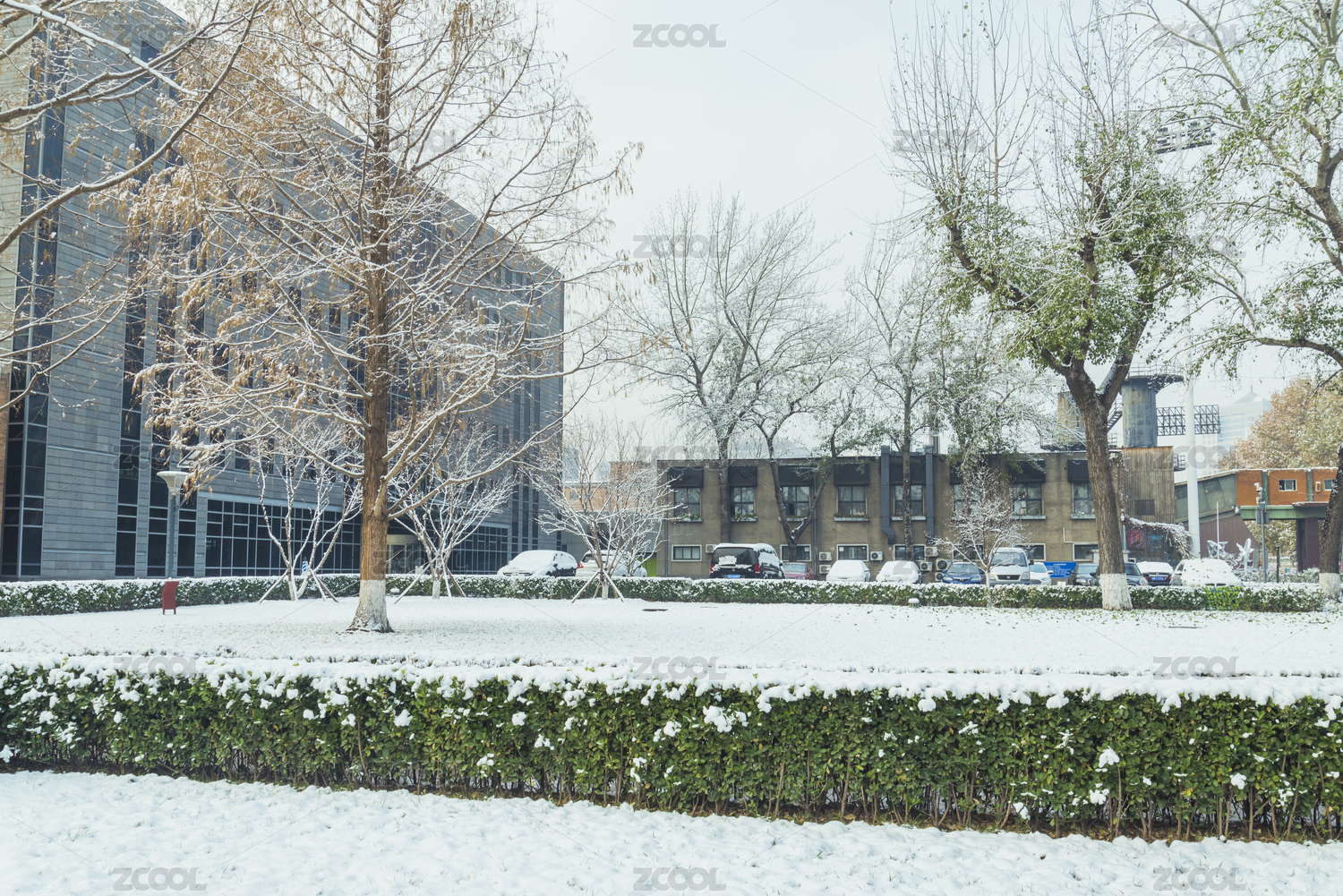 北京冬天的798艺术区广场的草坪覆盖满了白雪