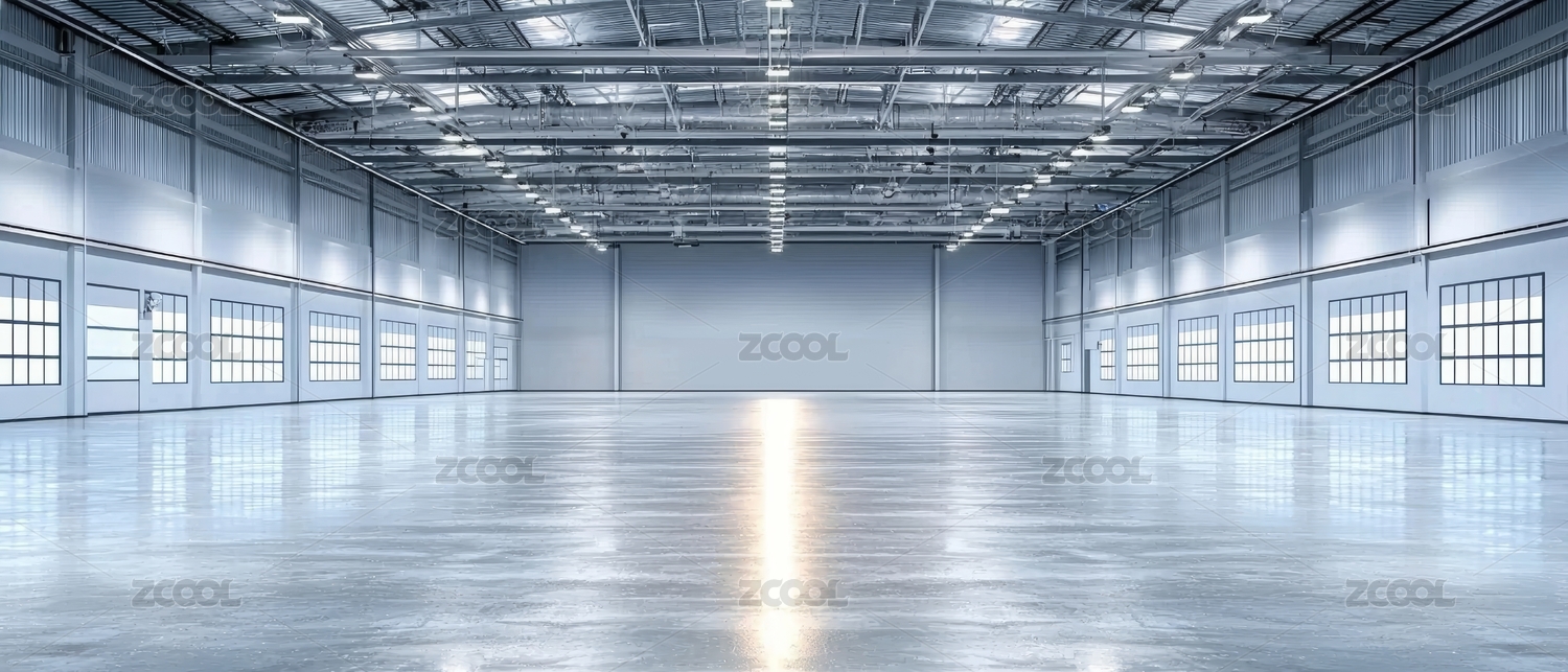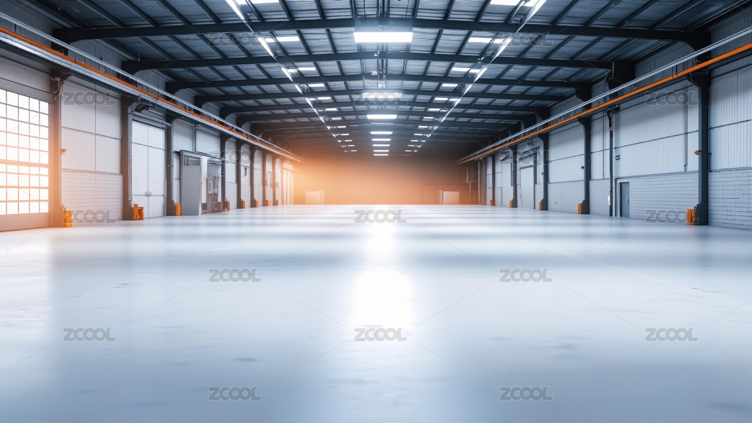 阳光下现代宽敞明亮的工厂仓库室内空间